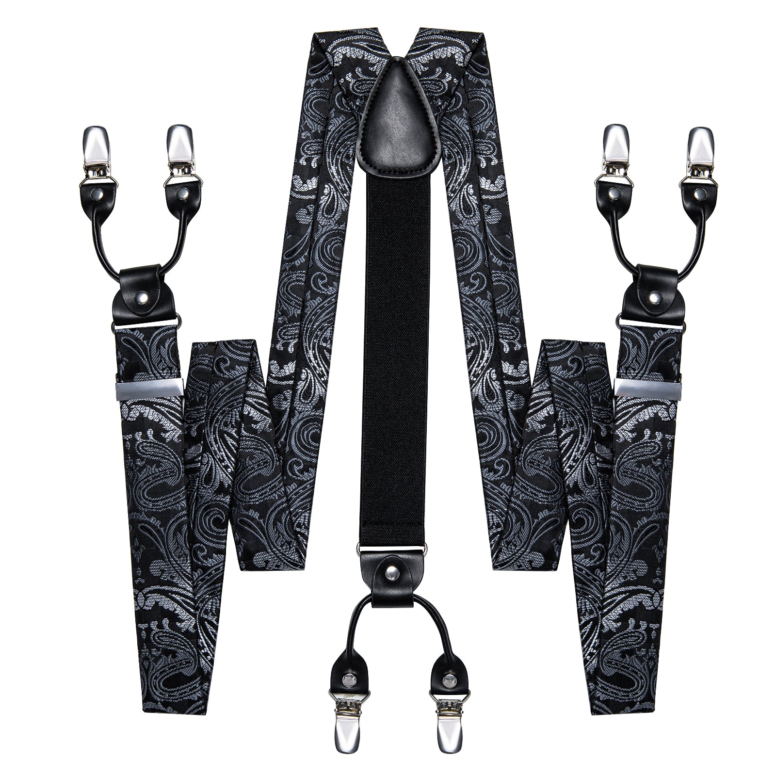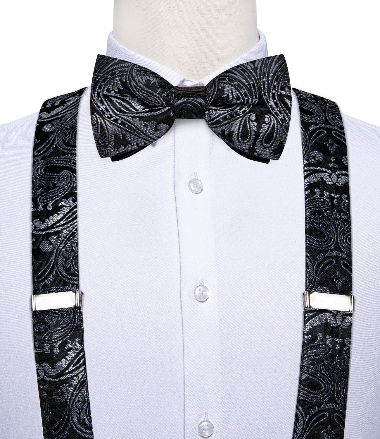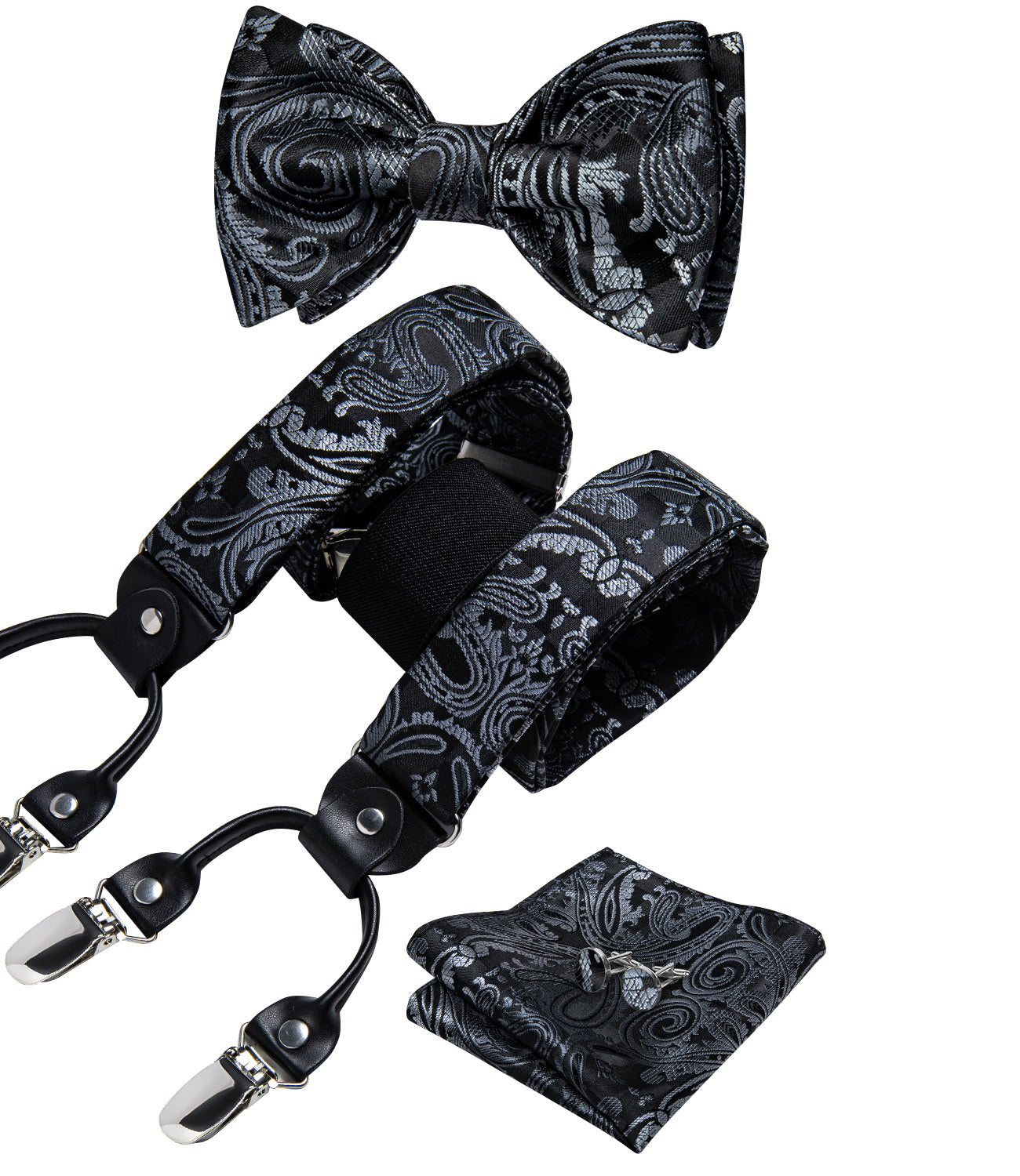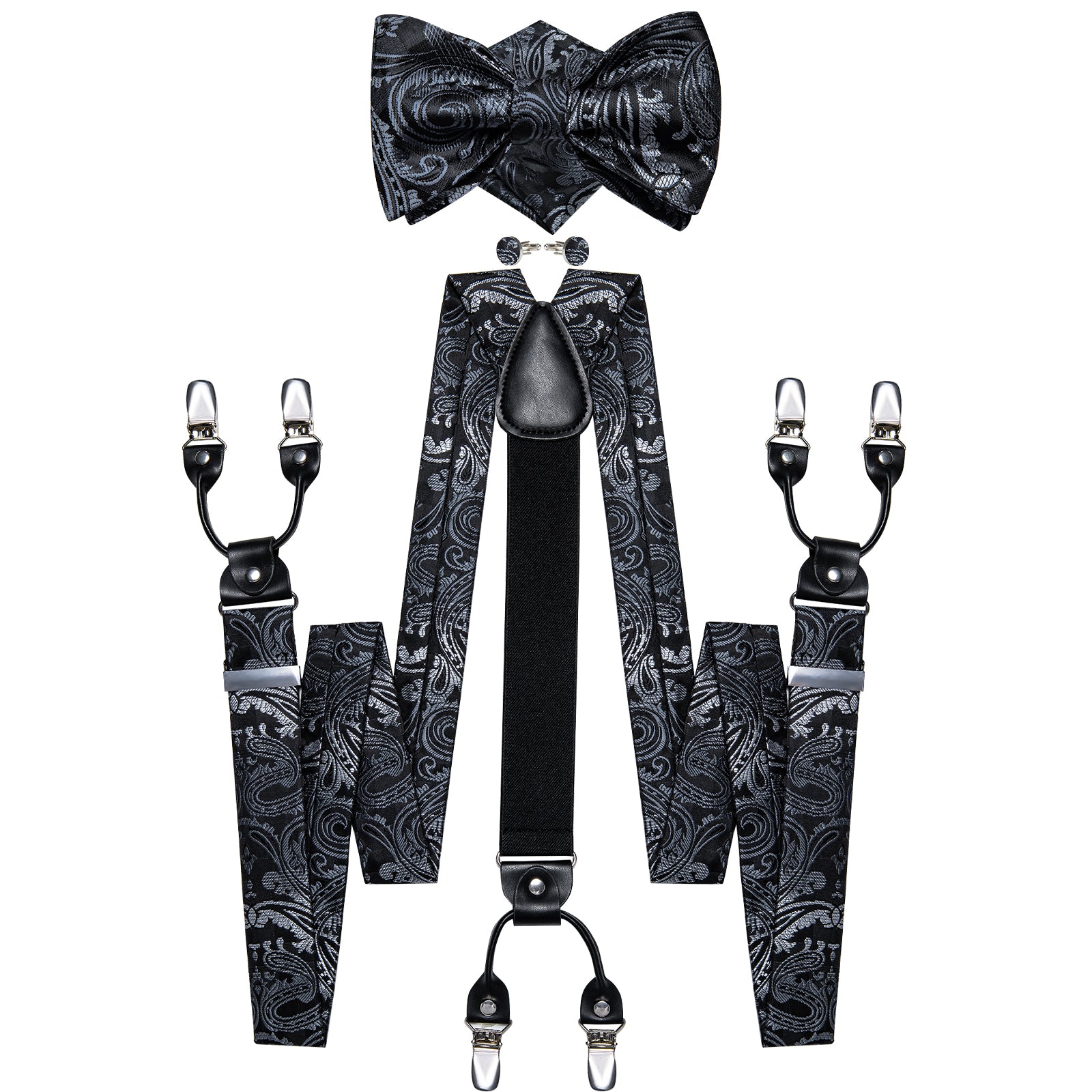 Black Silver Floral Brace Clip-on Men's Suspender with Bow Tie Set