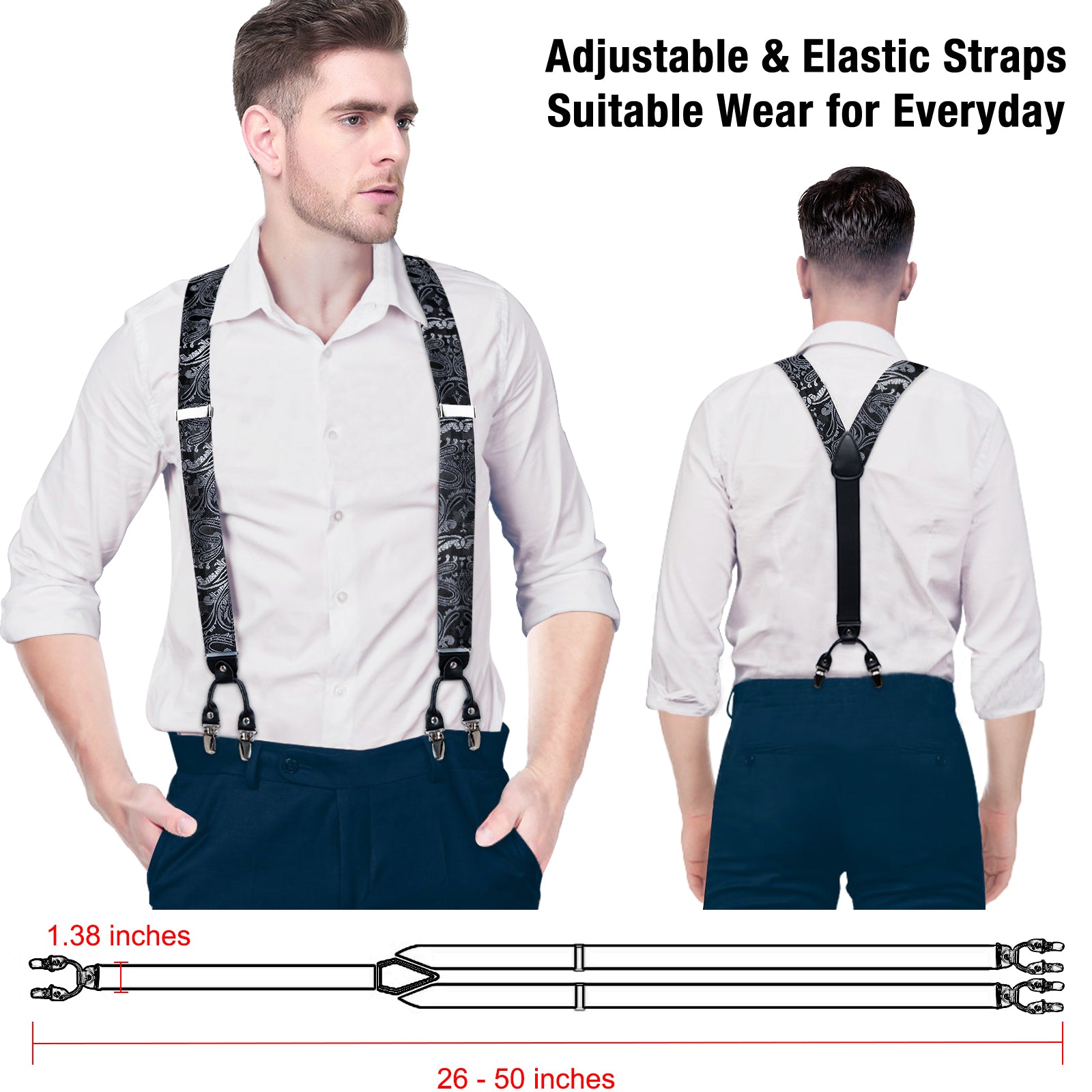 - Size:Suspender width is 1.38", length adjustable and the back part is elastic, total length Up to 50". Bowtie size: 4.7" *2.6", fit for neck size (Adjustable): 12"-22".