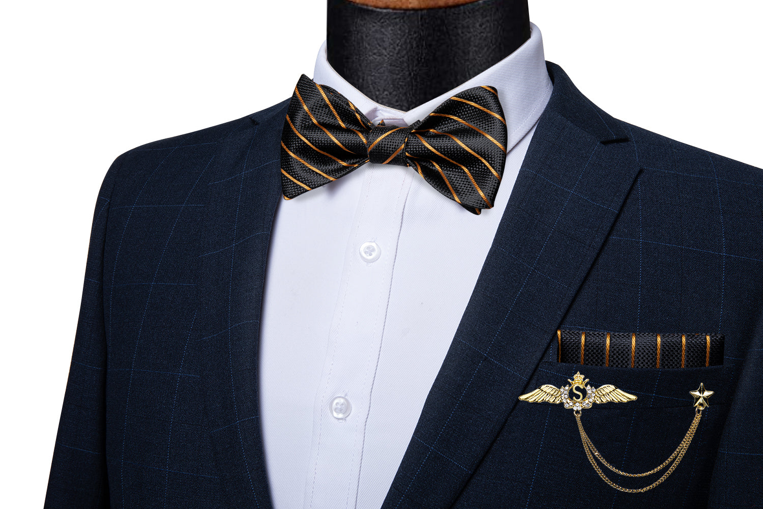 Black Yellow Striped Self-Bowtie Pocket Square Cufflinks With Wing Lapel Pin Brooch