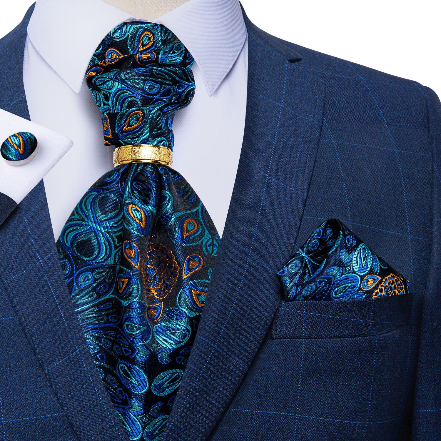 Cravat Set: Packing list:ascot, woven pocket square, ring, matching cufflinks, box. Cravat ascot are made of thick and high quality fabric, soft and comfortable. It's a perfect gifts for Father's day, Birthday, Christmas Day, Valentine's Day, Thanksgiving Day etc