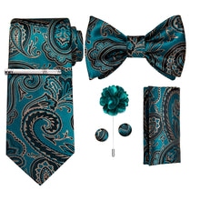 Blue Green Paisley Bowtie Necktie Hanky Cufflinks Brooch Clip Set