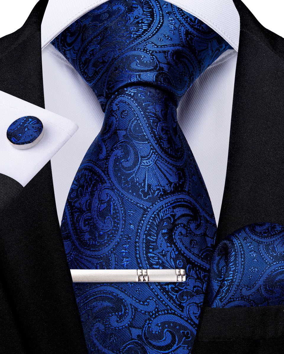 Blue Paisley Men's Tie Handkerchief Cufflinks Clip Set