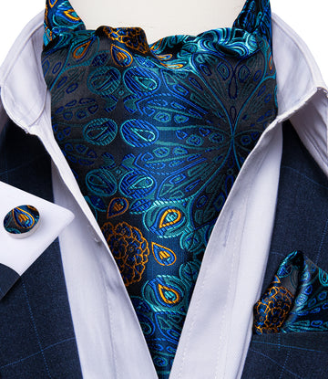 Blue Floral Silk Cravat Woven Ascot Tie Pocket Square Handkerchief Suit Set