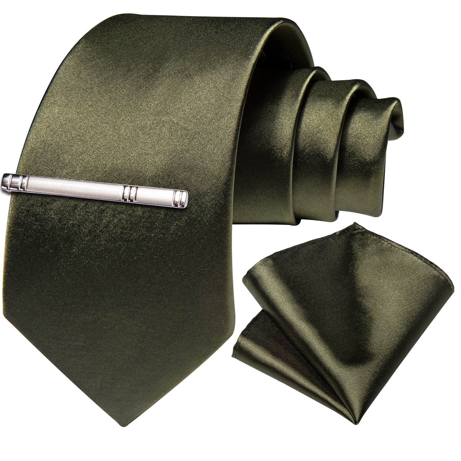 Brown Green Solid Men's Tie Pocket Square Handkerchief Clip Set