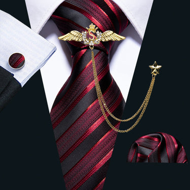 Burgundy Black Striped Tie Handkerchief Cufflinks Set With Wing Lapel Pin Set