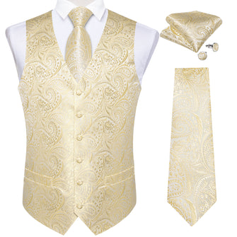 Champagne Paisley Jacquard Silk Waistcoat Vest Tie Pocket Square Cufflinks Set