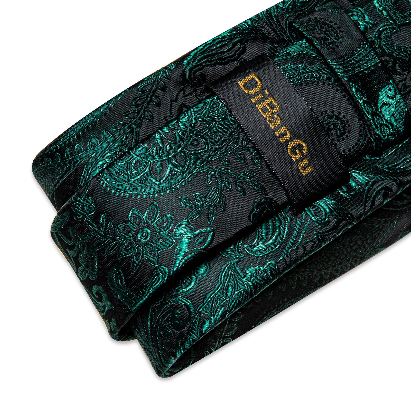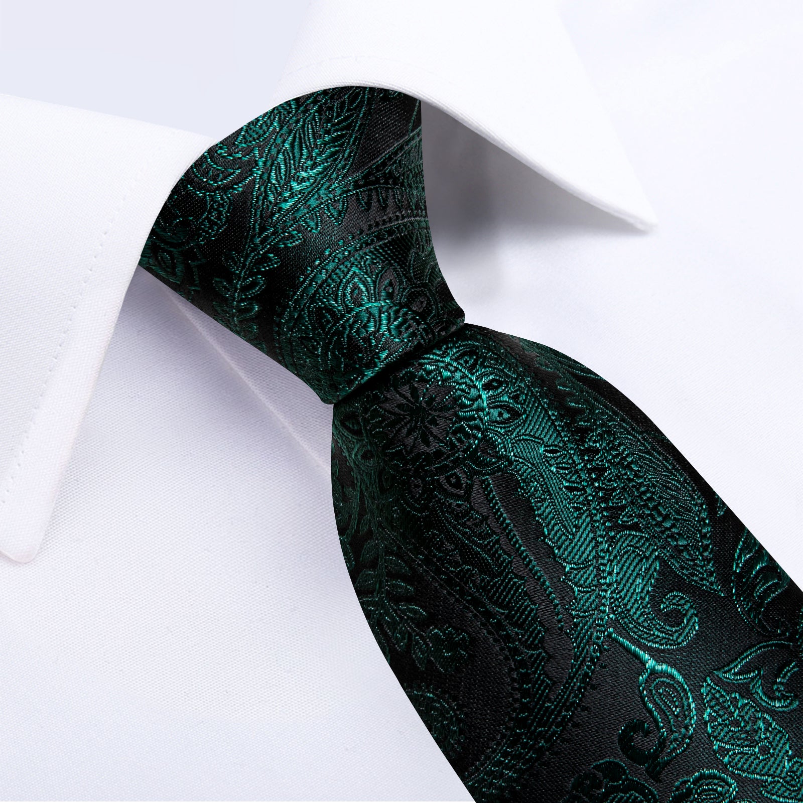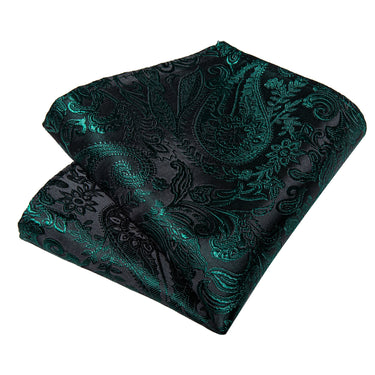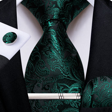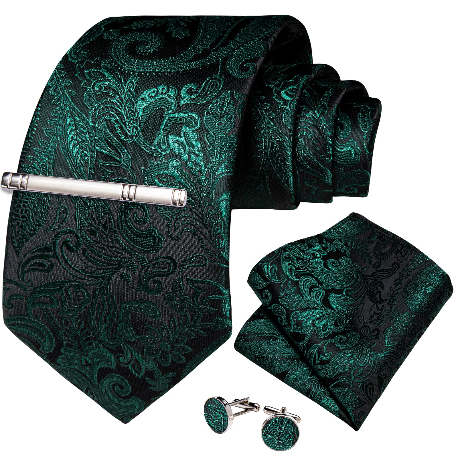 Dark Green Floral Men's Tie Handkerchief Cufflinks Clip Set