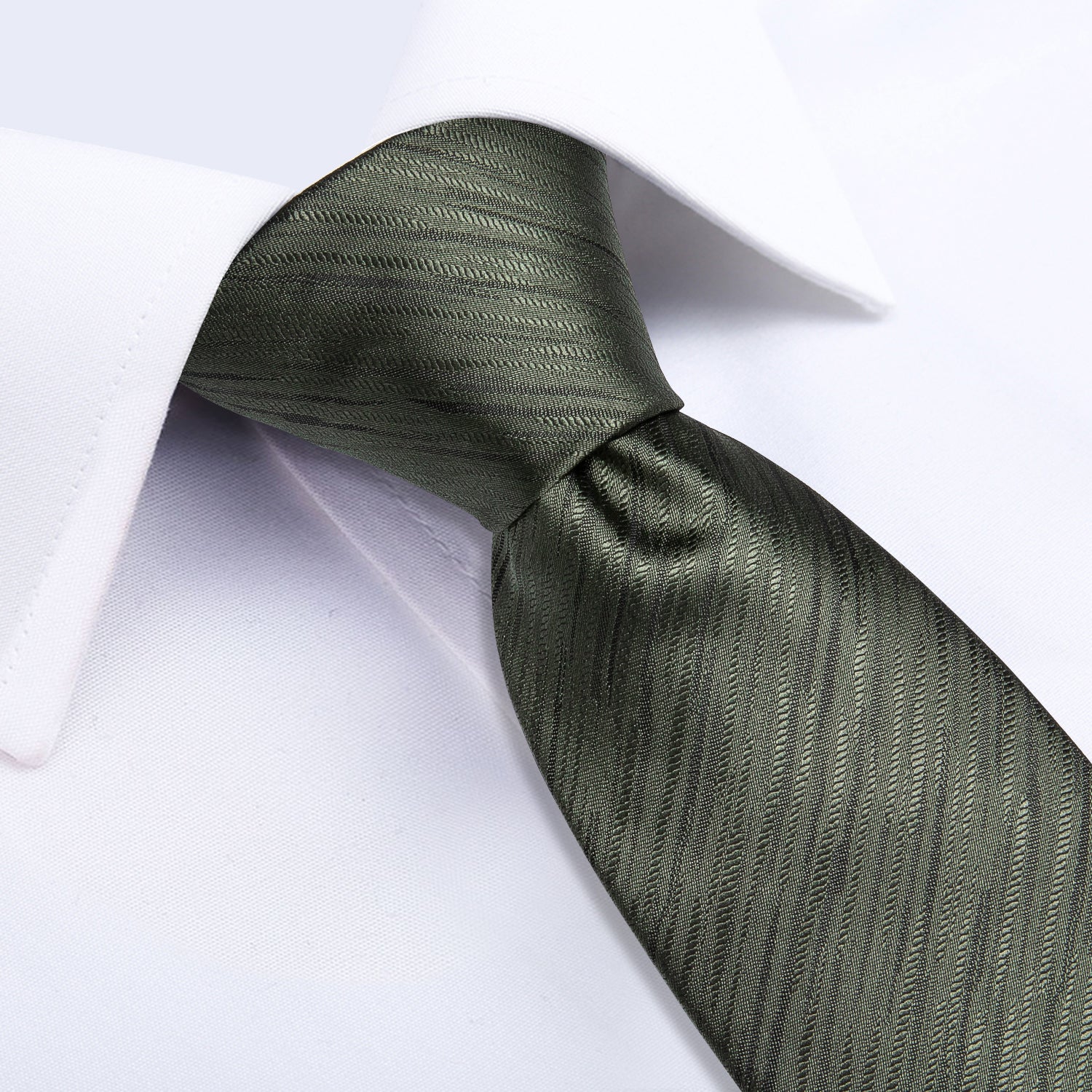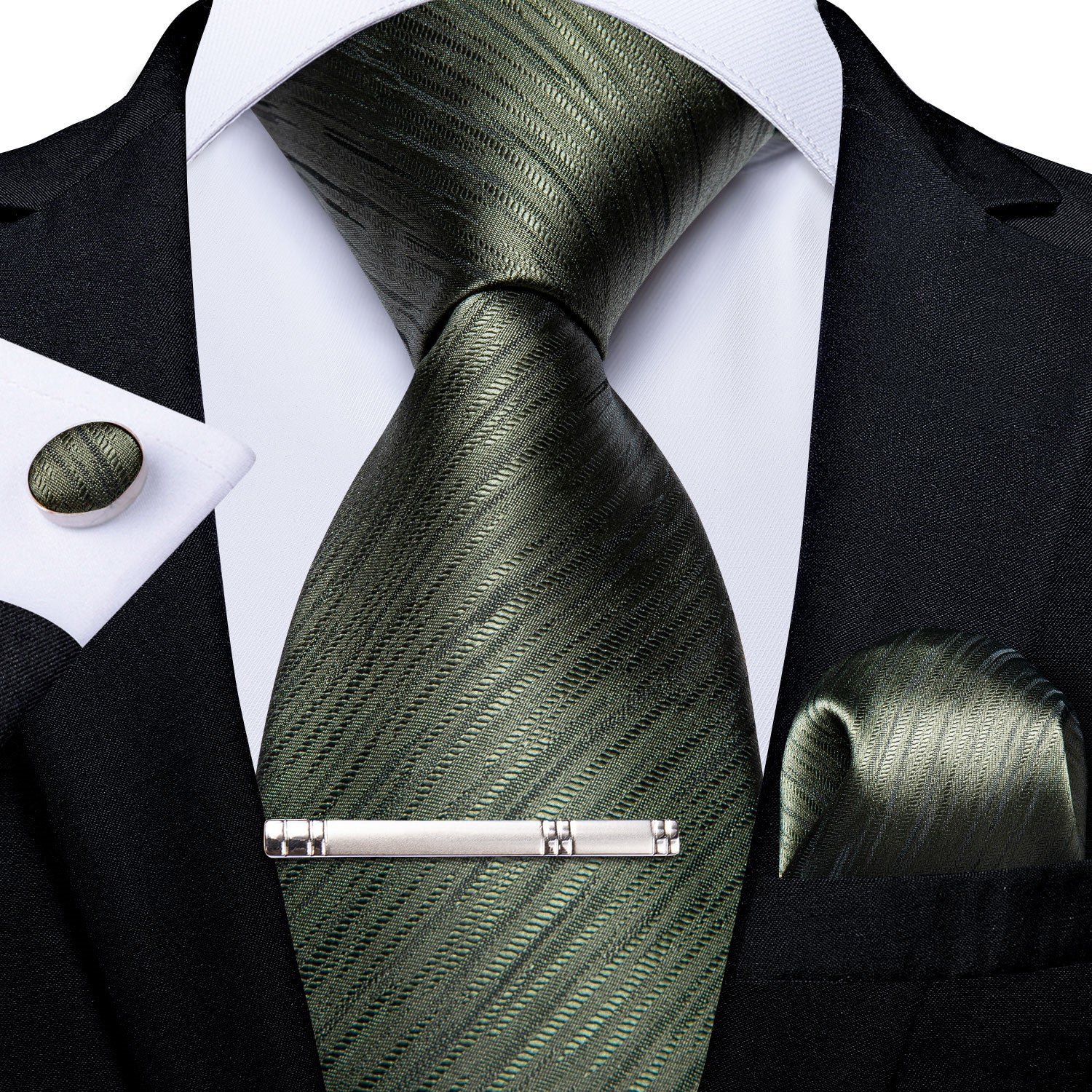 Dark Green Striped Men's Tie Handkerchief Cufflinks Clip Set