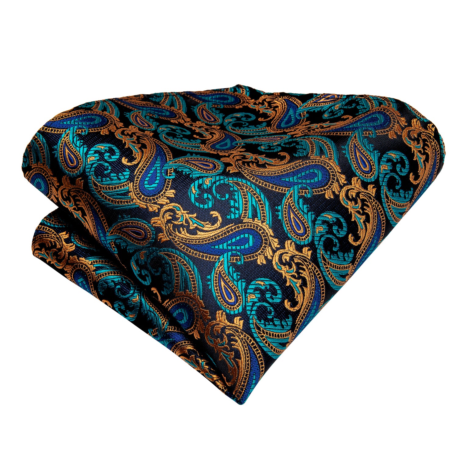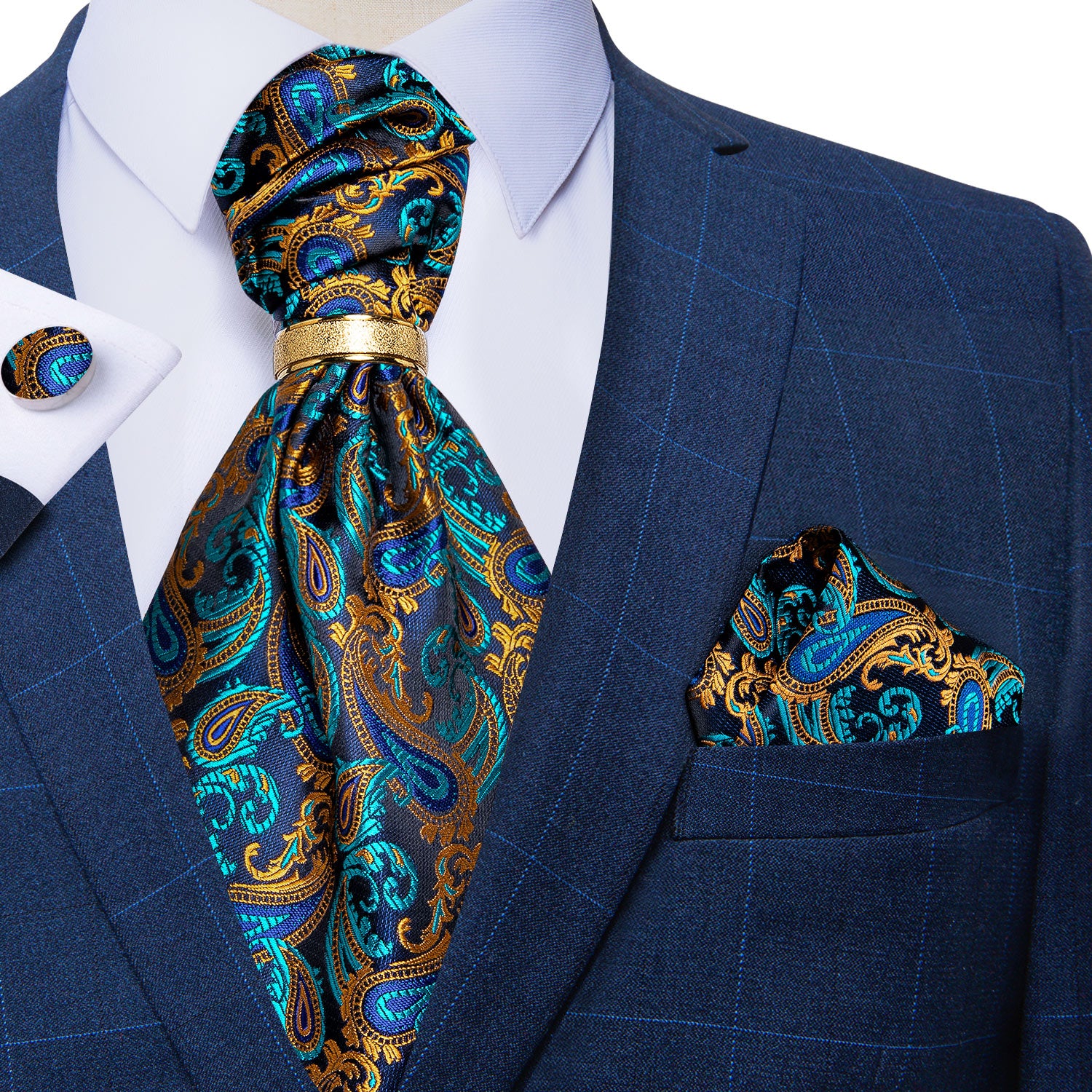 DiBanGu Ascot Tie Blue Brown Paisley Silk Cravat Tie Hanky Cufflinks With Tie Ring Set