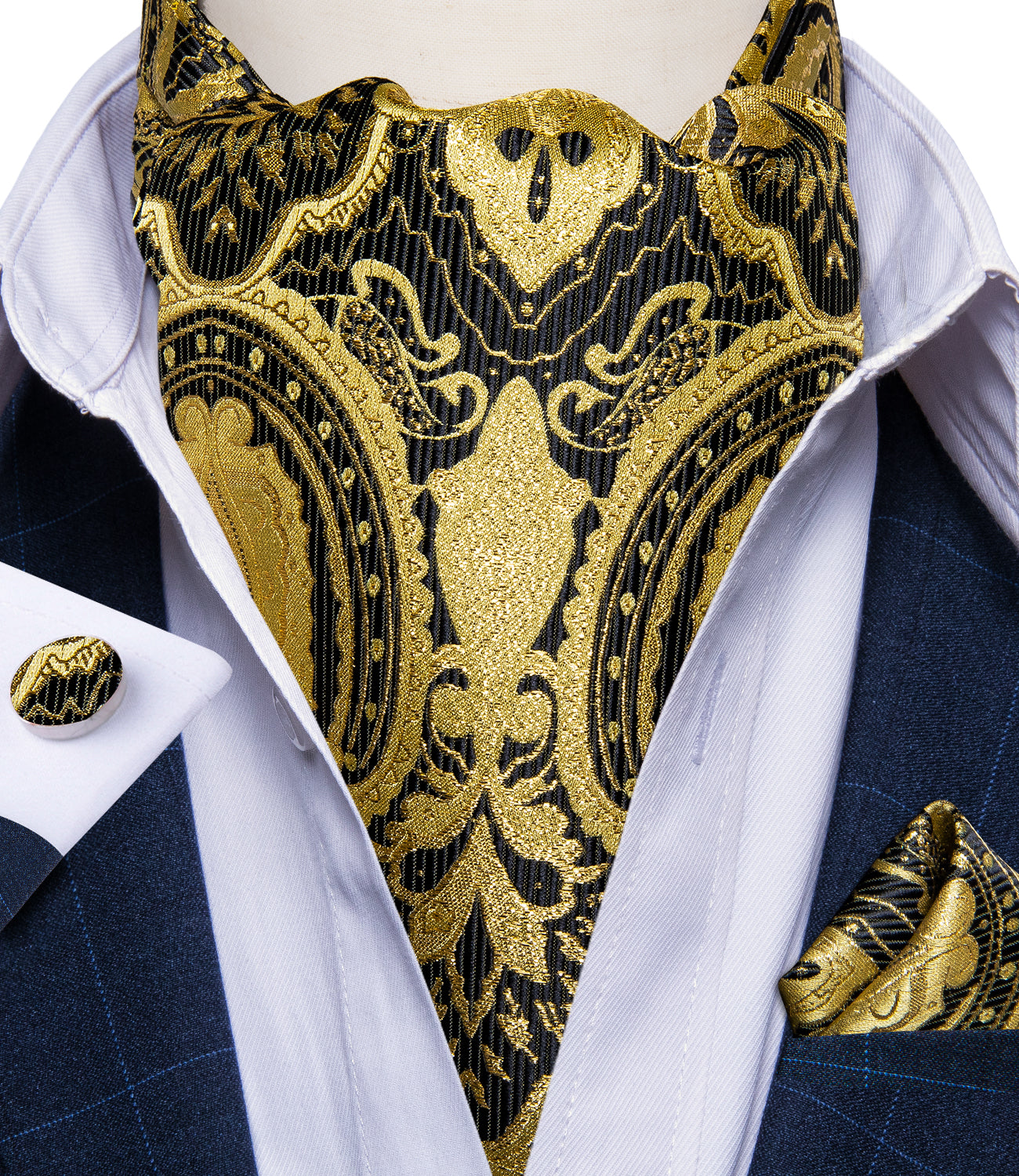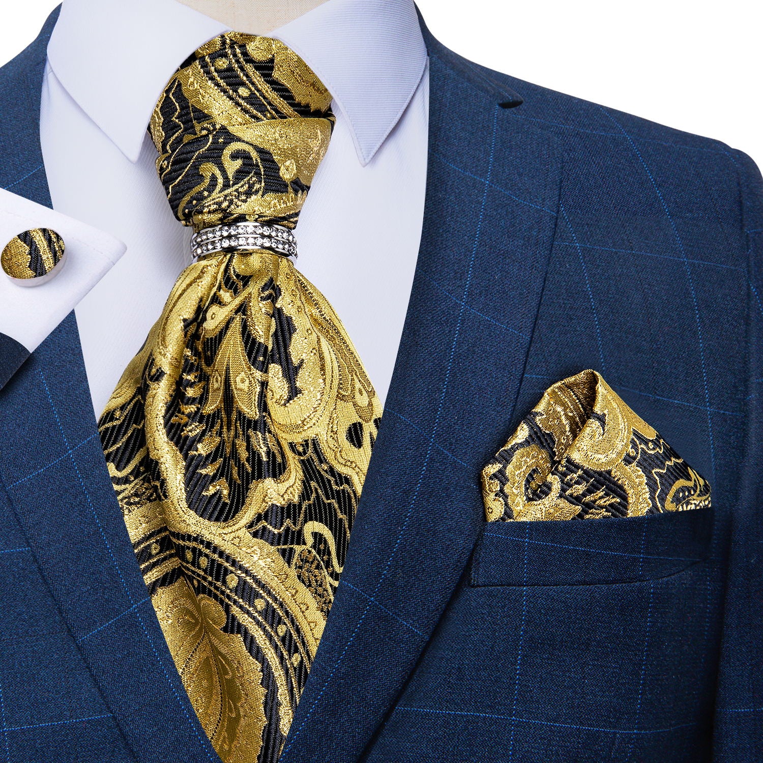 Cravat Set: Packing list:ascot, woven pocket square, ring, matching cufflinks, box. Cravat ascot are made of thick and high quality fabric, soft and comfortable. It's a perfect gifts for Father's day, Birthday, Christmas Day, Valentine's Day, Thanksgiving Day etc