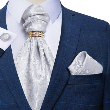 DiBanGu Ascot Tie Silver Floral Silk Cravat Woven Ascot Tie Pocket Square Cufflinks With Tie Ring Set