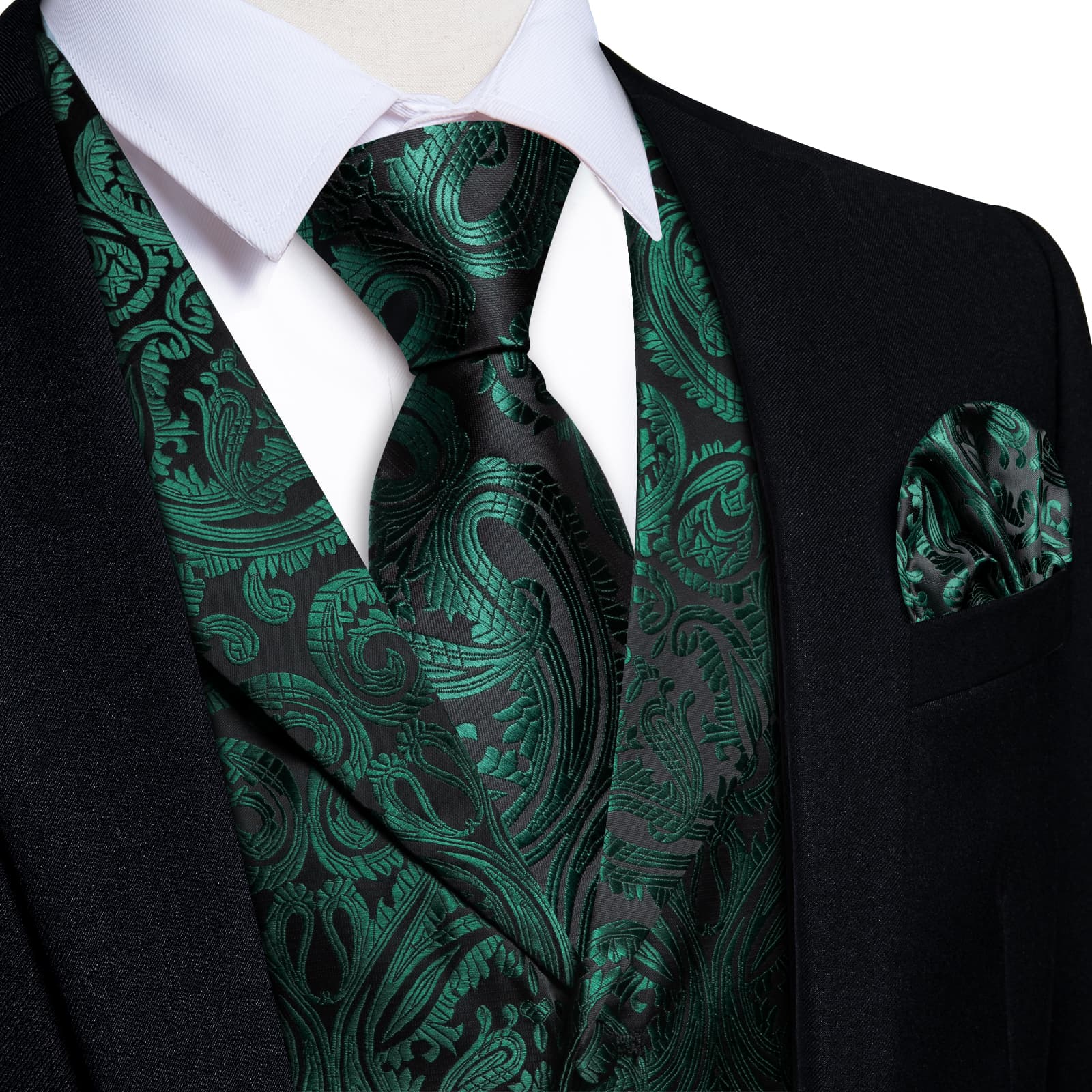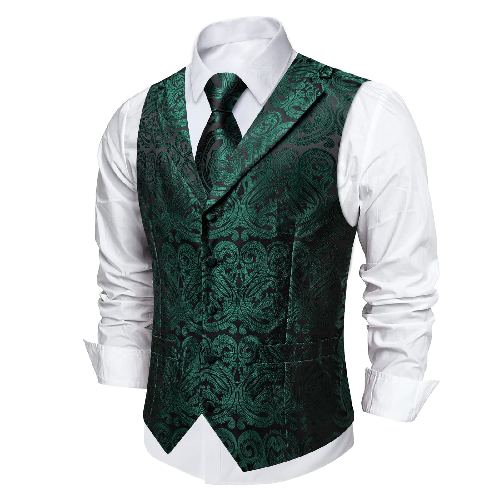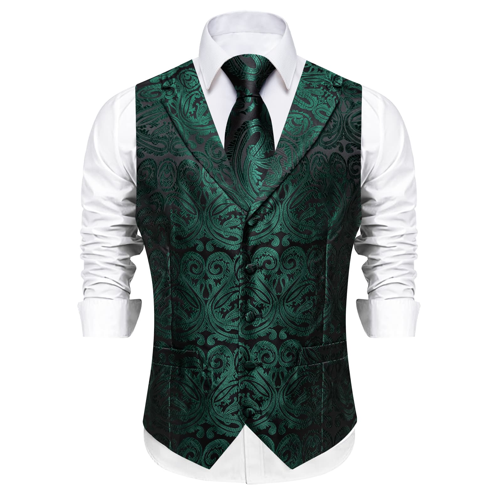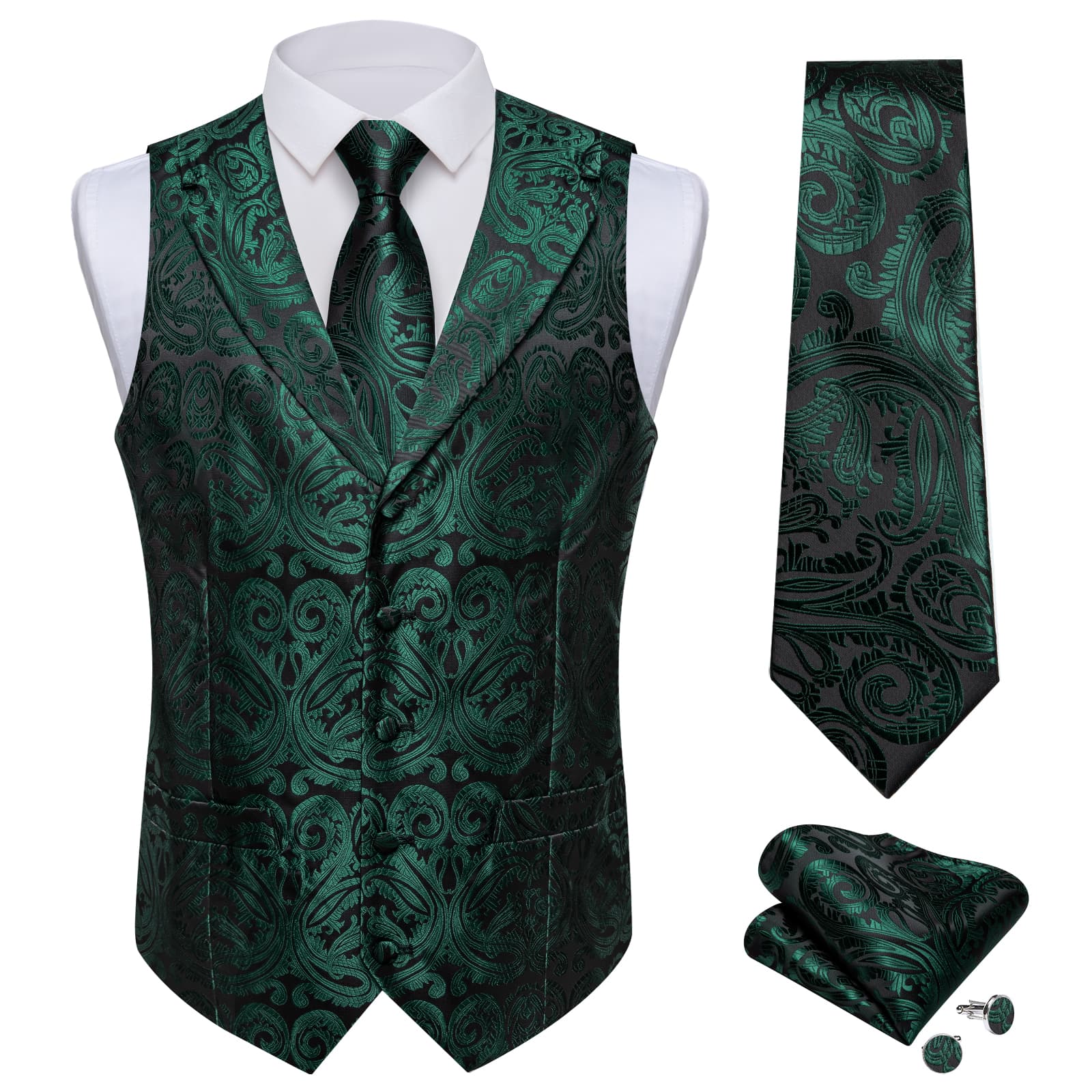DiBanGu Dark Green Paisley Notched Collar Silk Mens Dress Vest Tie Set