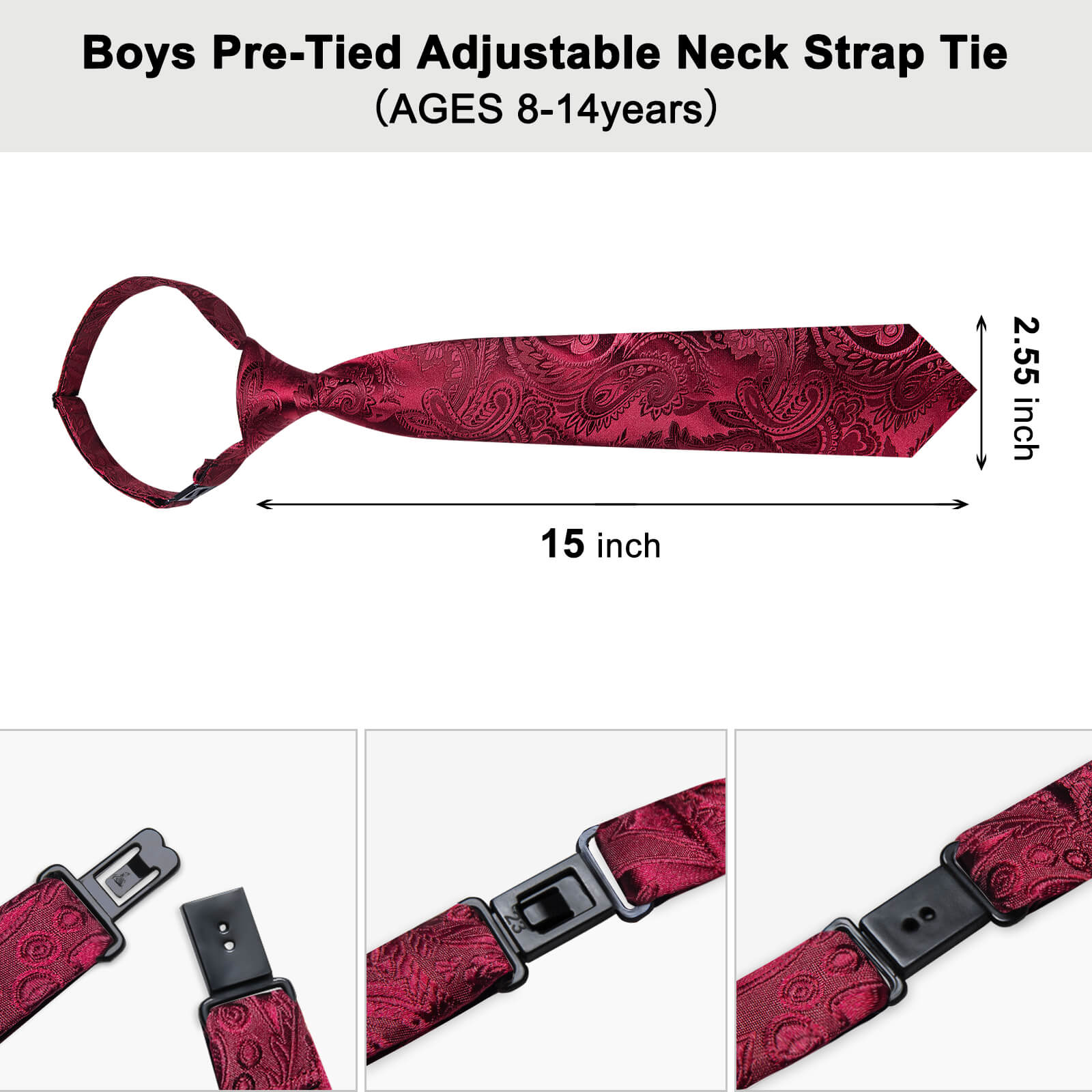 【Classic Size】Tie size:2.55 inches Wide and 15 inches from Knot to Bottom , Pocket Square size: 7.87 x 7.87 inches. Pre-tied boy's tie is suitable for 8-14 -year-old boys