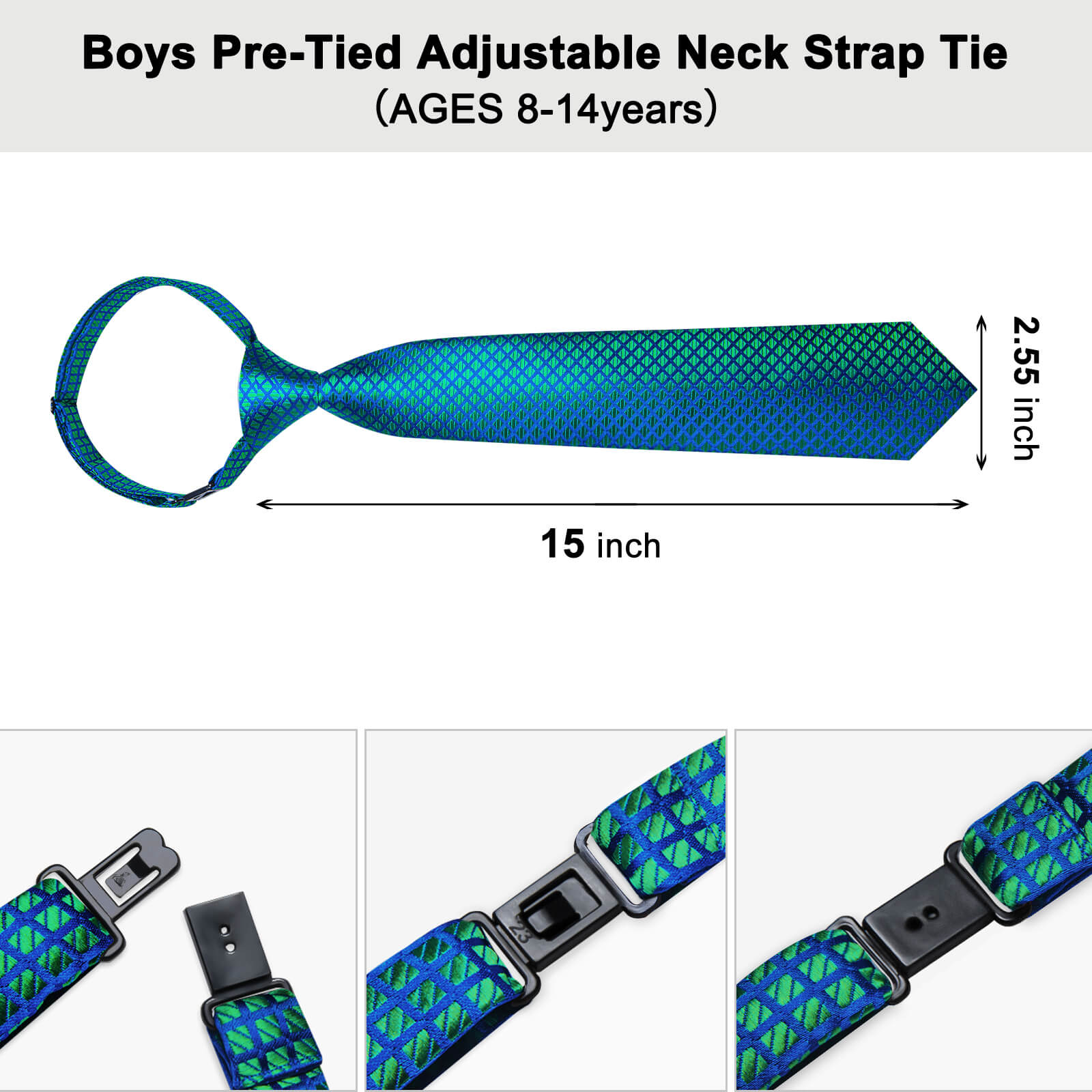 【Classic Size】Tie size:2.55 inches Wide and 15 inches from Knot to Bottom , Pocket Square size: 7.87 x 7.87 inches. Pre-tied boy's tie is suitable for 8-14 -year-old boys