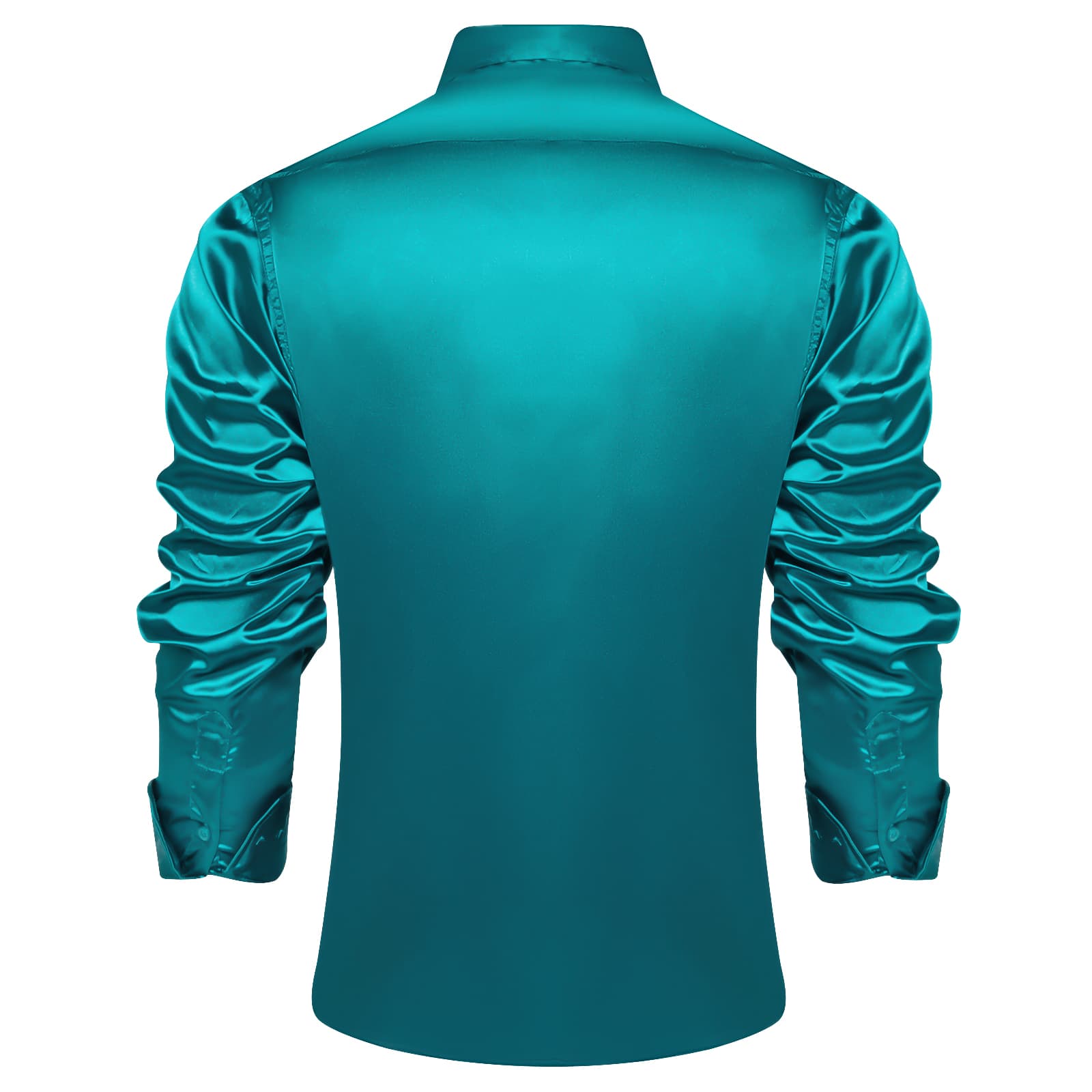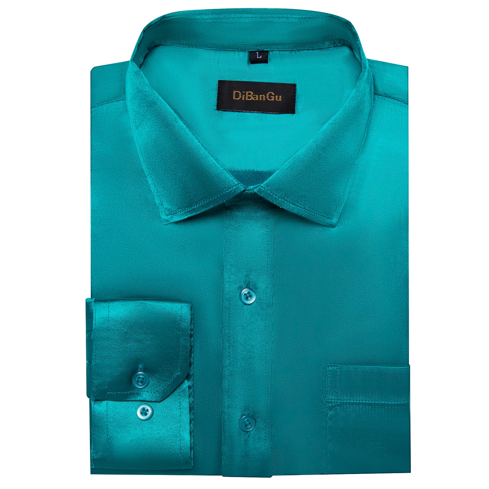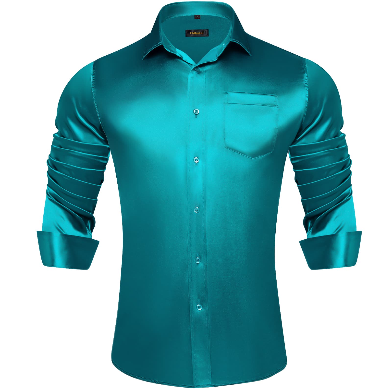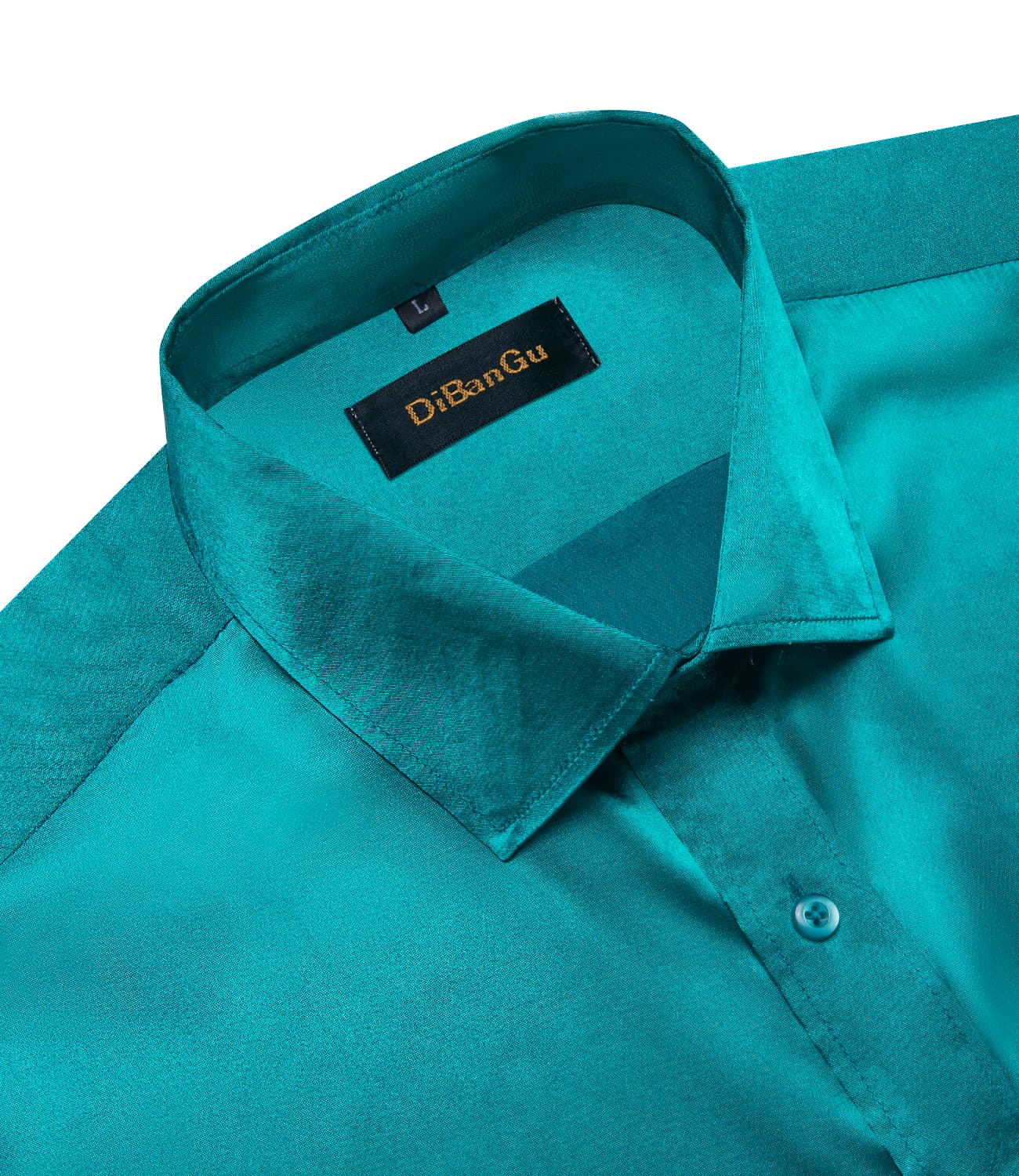 DiBanGu Long Sleeve Shirt Dark Cyan Solid Silk Satin Mens Dress Shirt