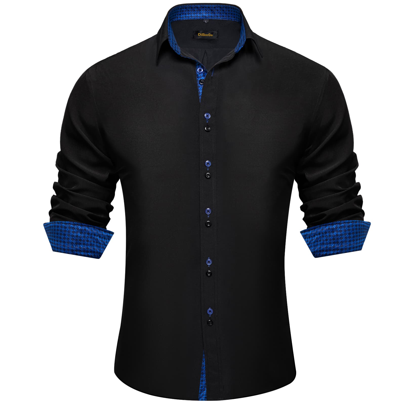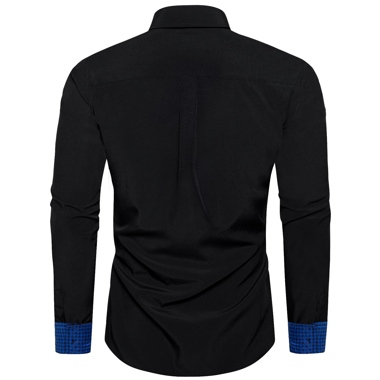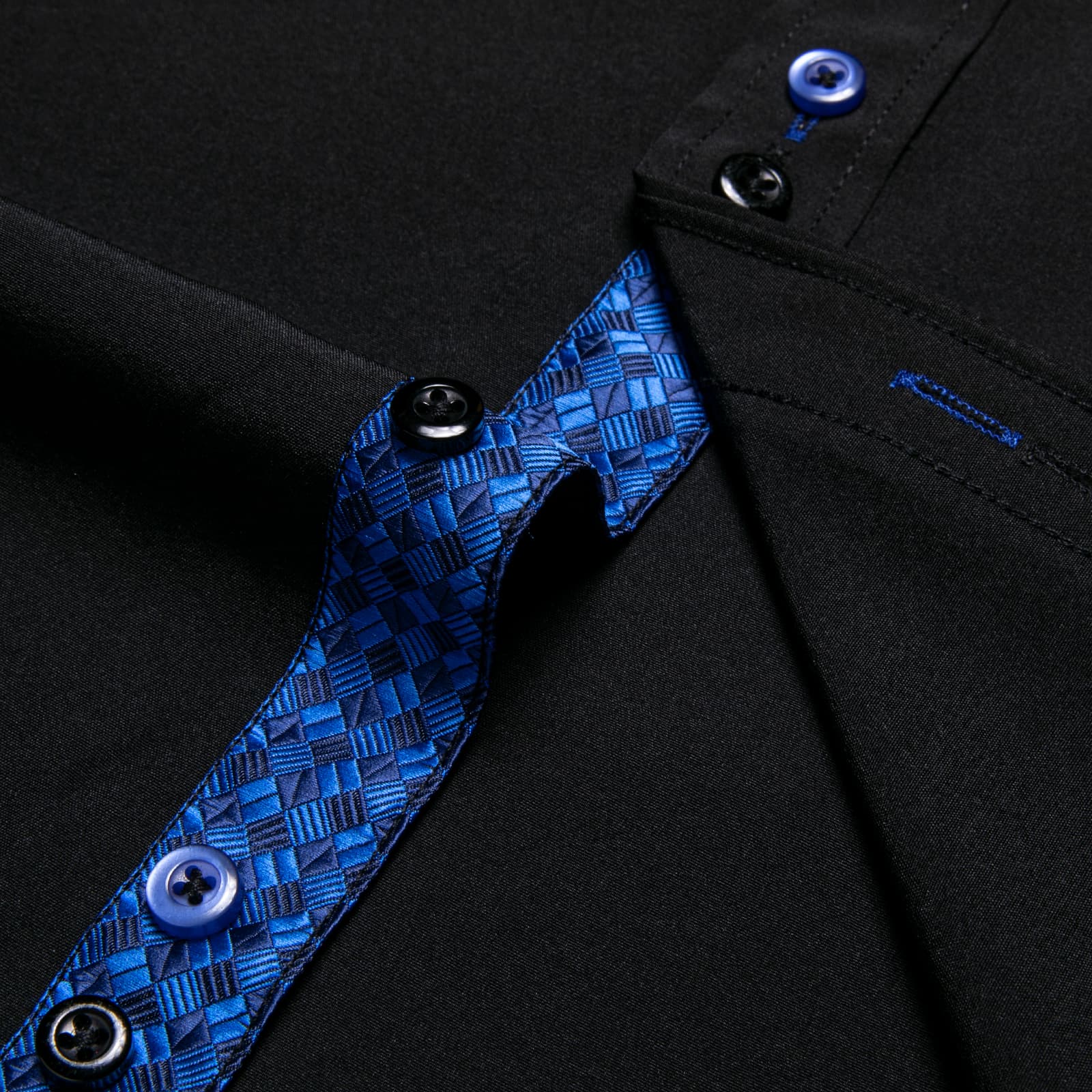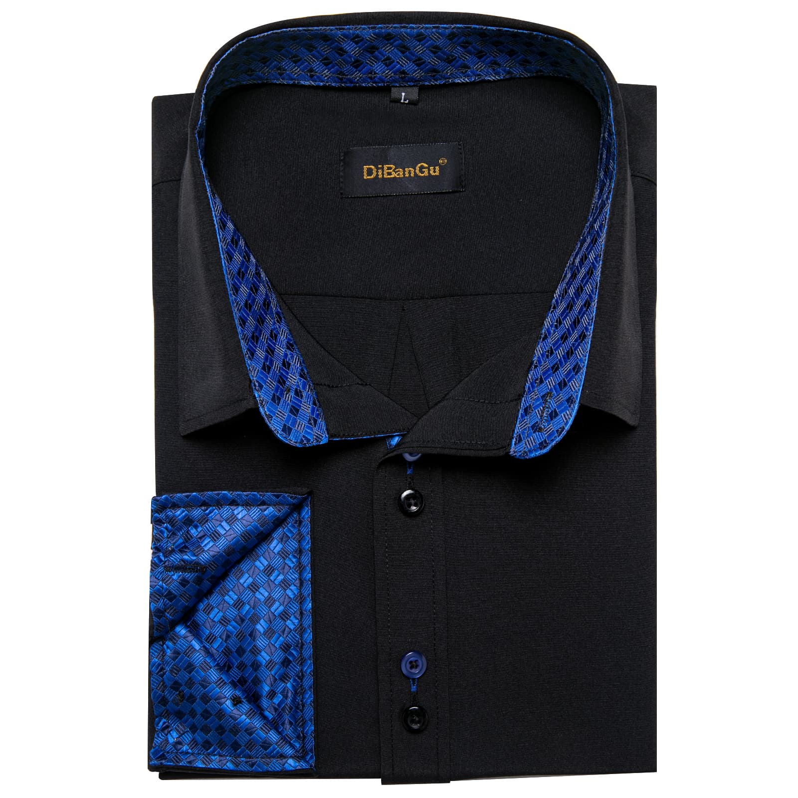 DiBanGu Mens Dress Shirt Black Solid Blue Plaid Splicing Silk Long Sleeve Shirt