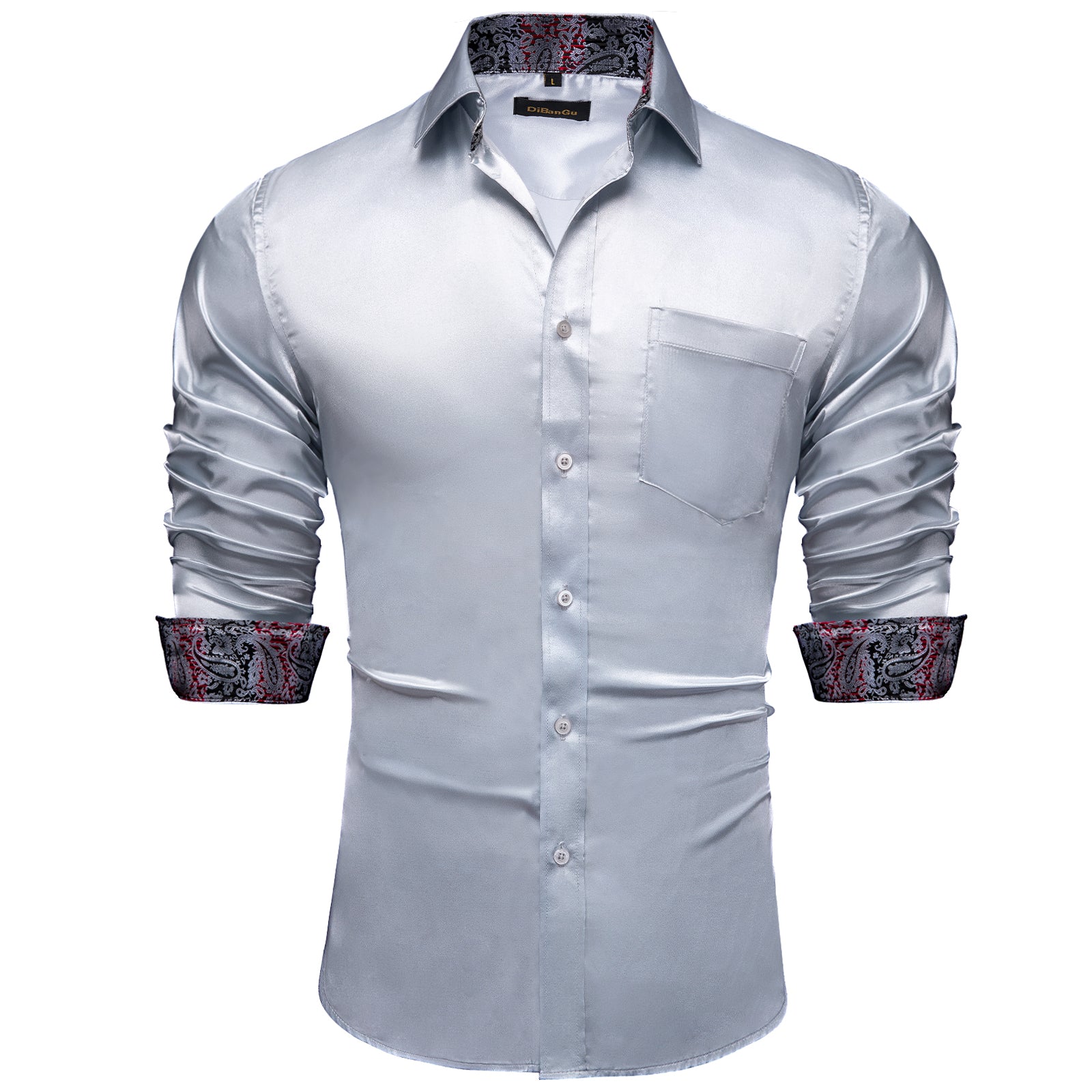 DiBanGu Men's Silver Grey Satin Solid Dress Shirt