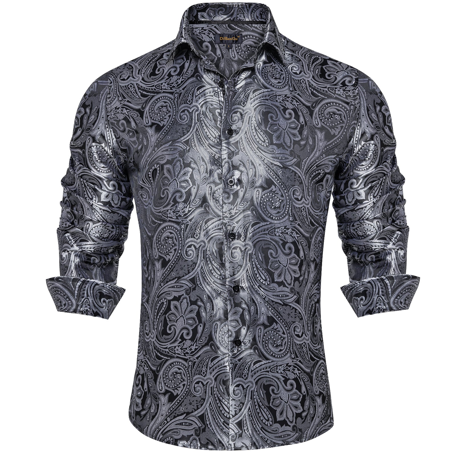 DiBanGu Shirts for Men Grey Silver Floral Silk Men's Long Sleeve Shirt