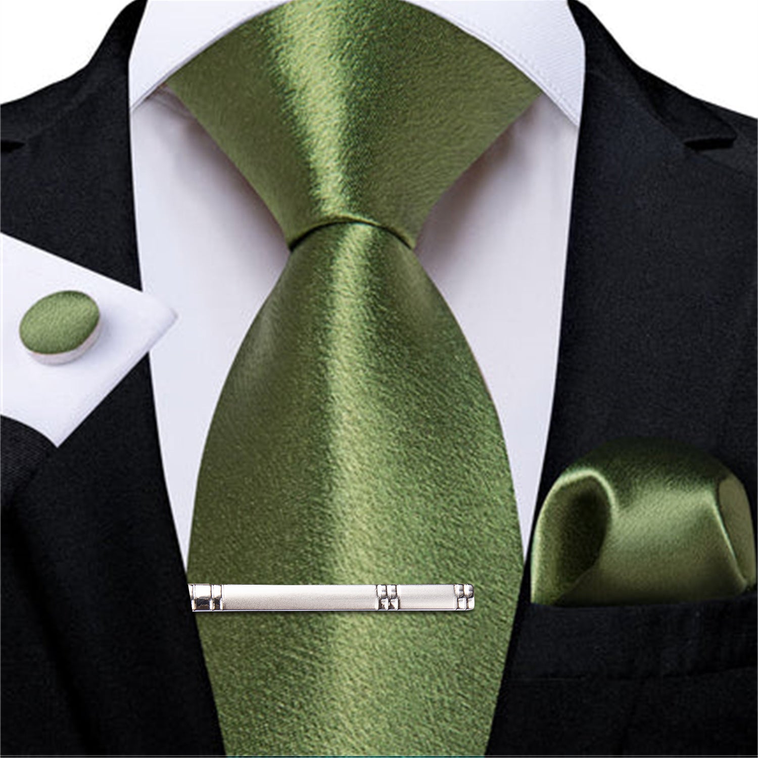 DiBanGu Silk Tie Shining Sage Green Solid Mens Formal Work Dresses Tie Handkerchief Cufflinks Clip Set