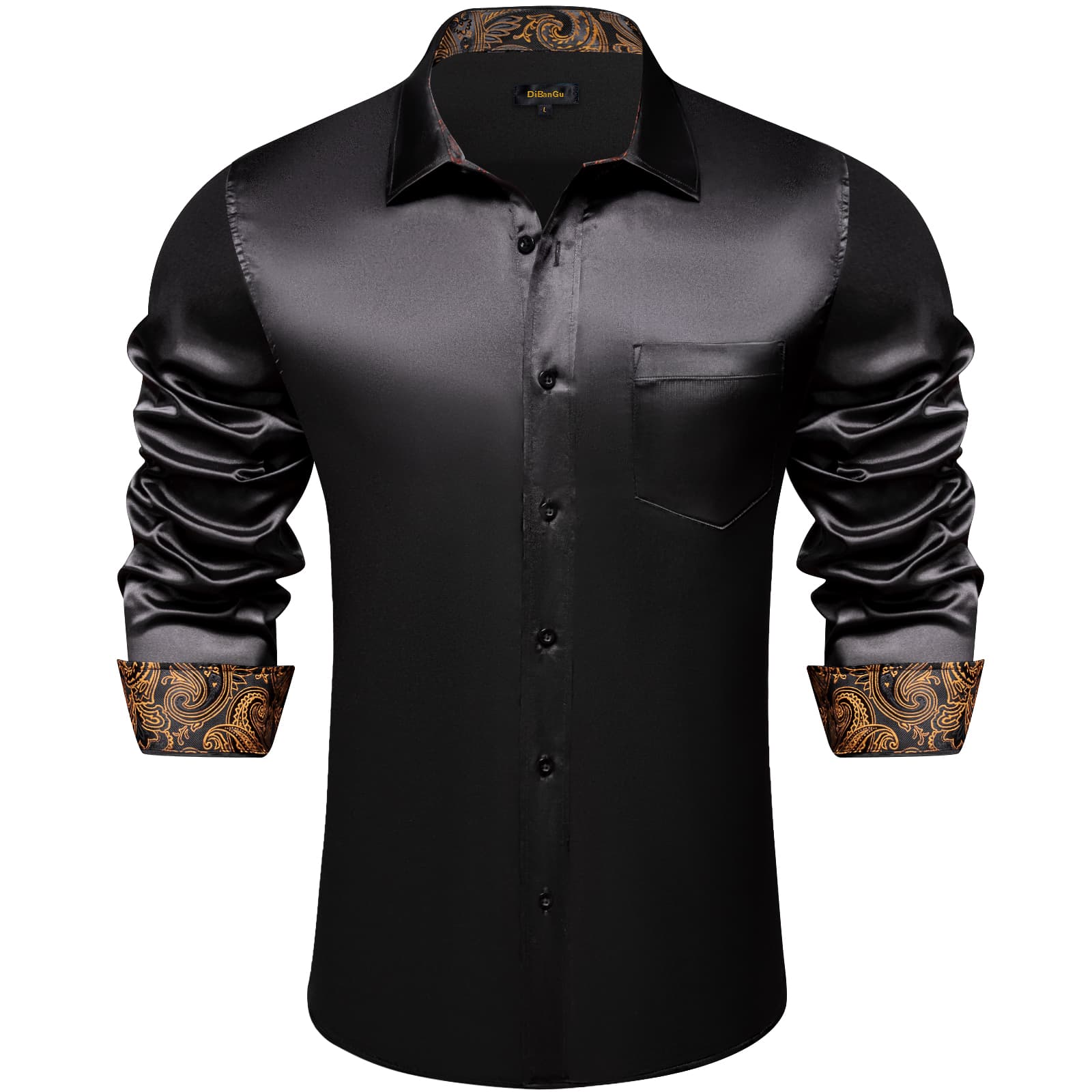 DiBanGu Tuxedo Shirt Onyx Black Solid Satin Silk Button Up Long Sleeve Shirt for Men