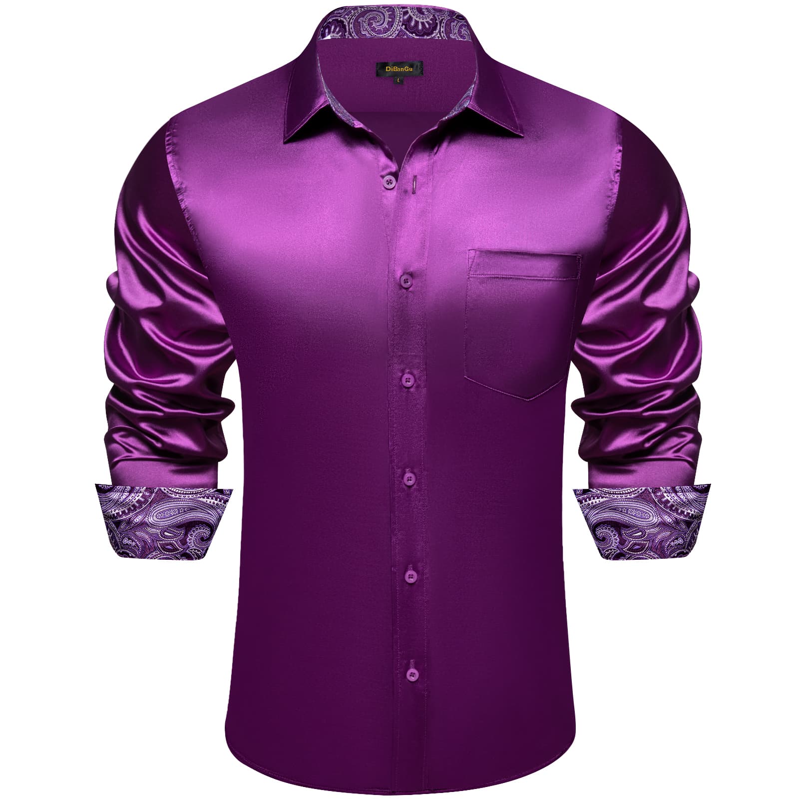 DiBanGu Tuxedo Shirt Palatinate Purple Solid Satin Silk Button Up Long Sleeve Shirt for Men