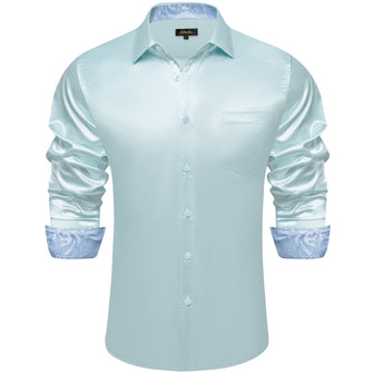 DiBanGu Tuxedo Shirt Pastel Blue Solid Satin Silk Button Up Long Sleeve Men's Dress Shirt