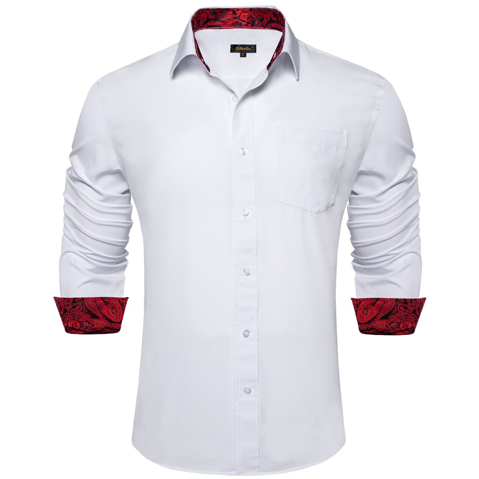 DiBanGu White Solid Splicing Dark Red Paisley Silk Mens Long Sleeve Shirt