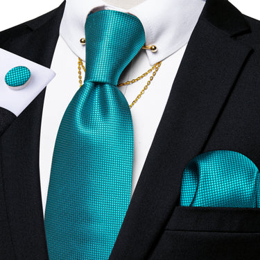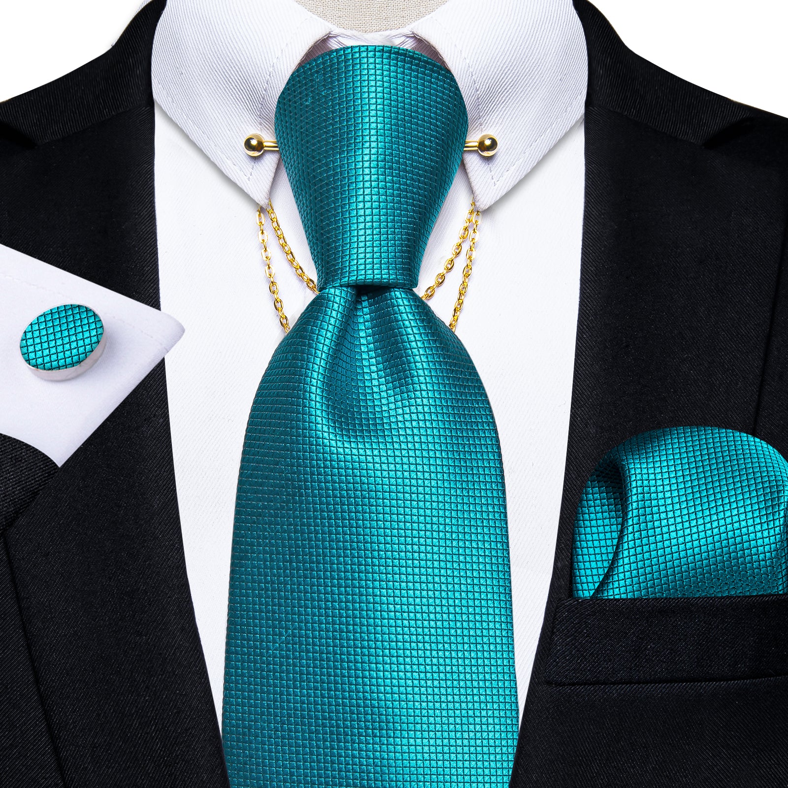 Elegent Teal Solid Tie Pocket Square Cufflinks Set with Collar Pin