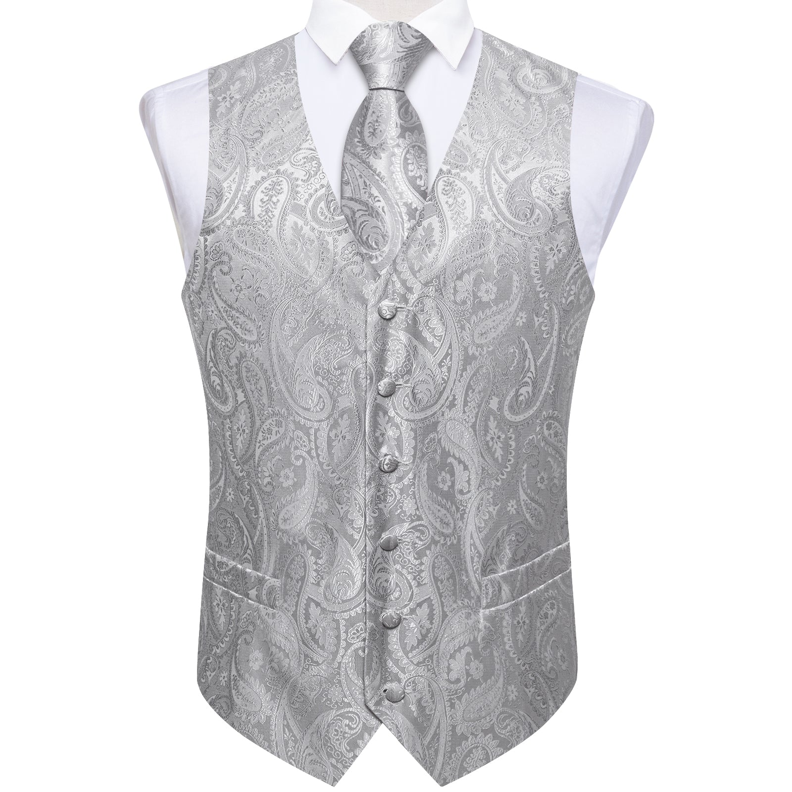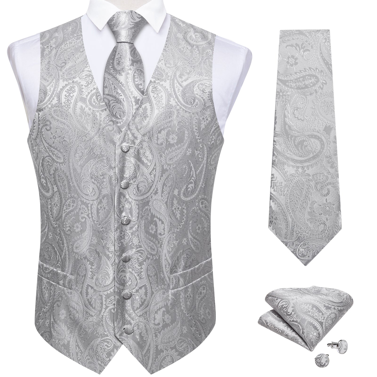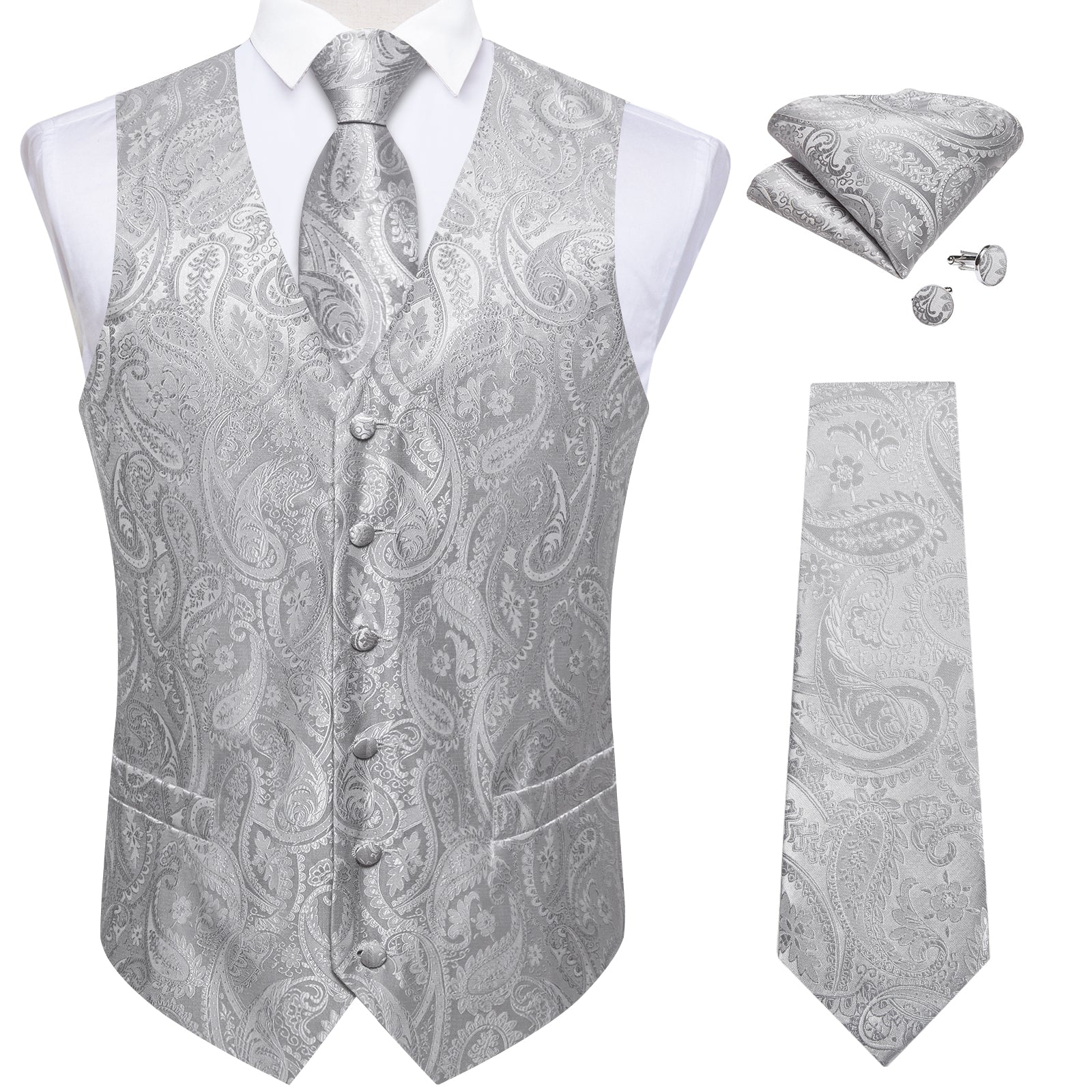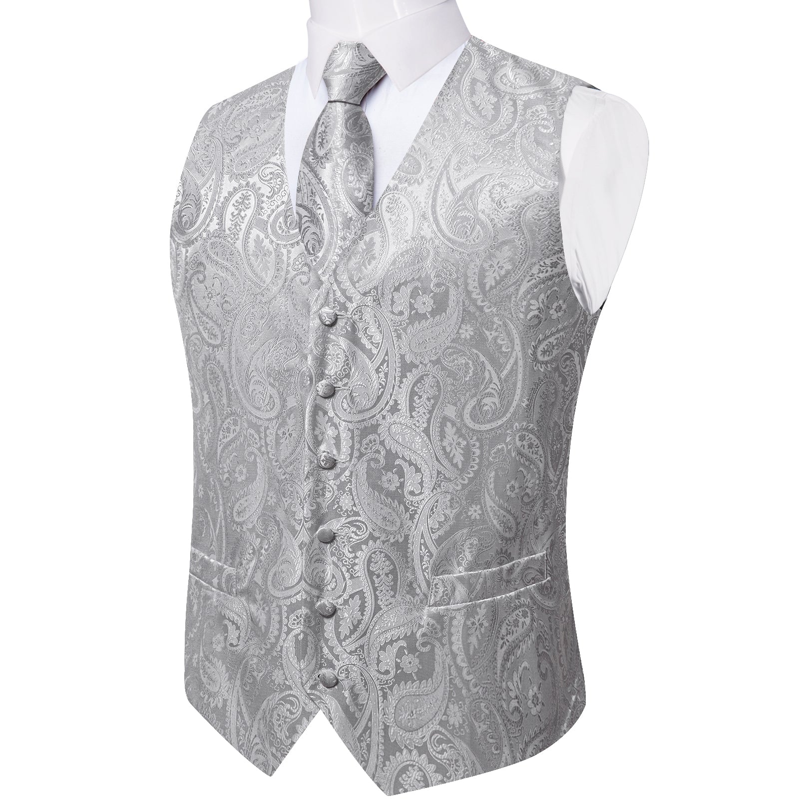 Formal Silver Grey Paisley Jacquard Silk Waistcoat Vest Necktie Handkerchief Cufflinks Set