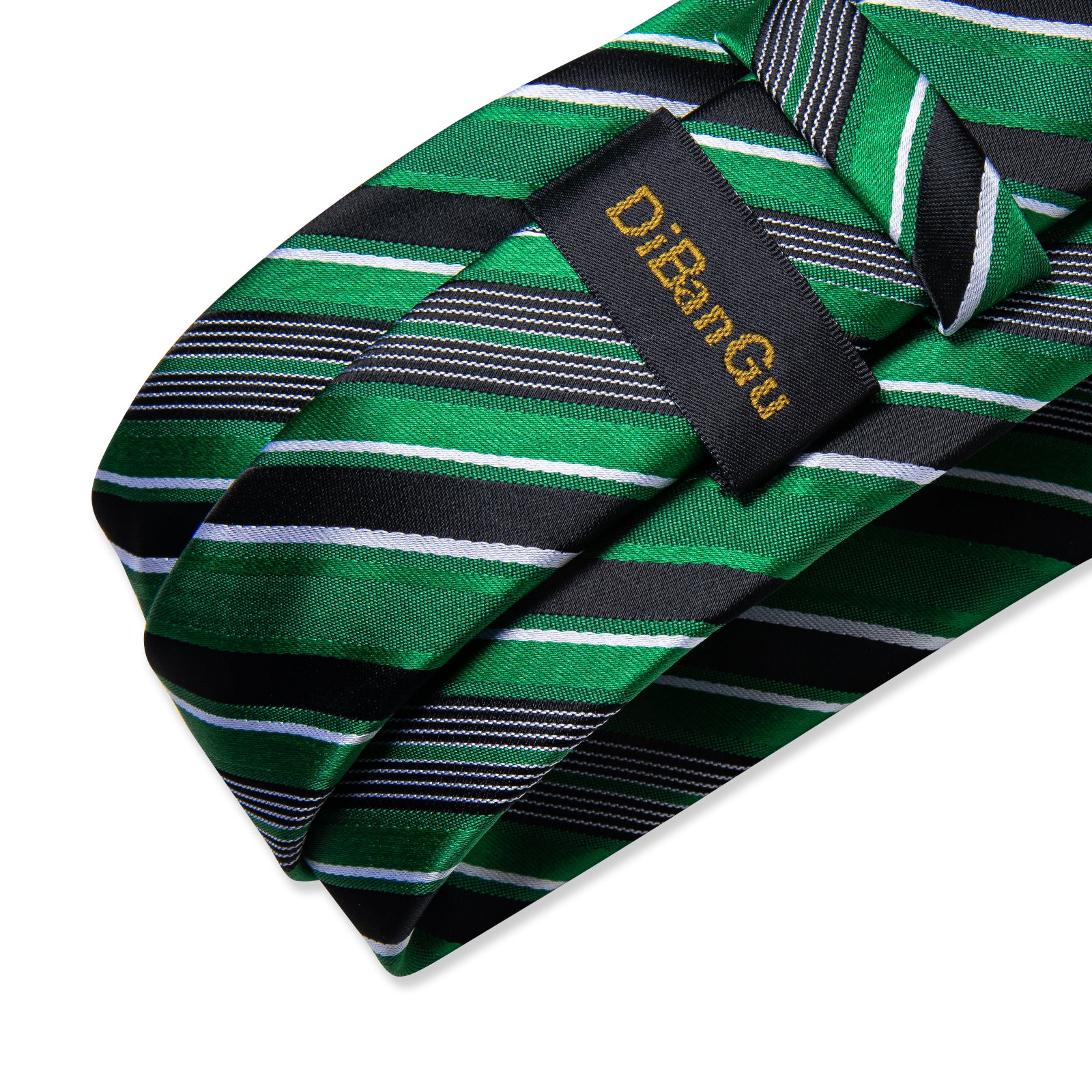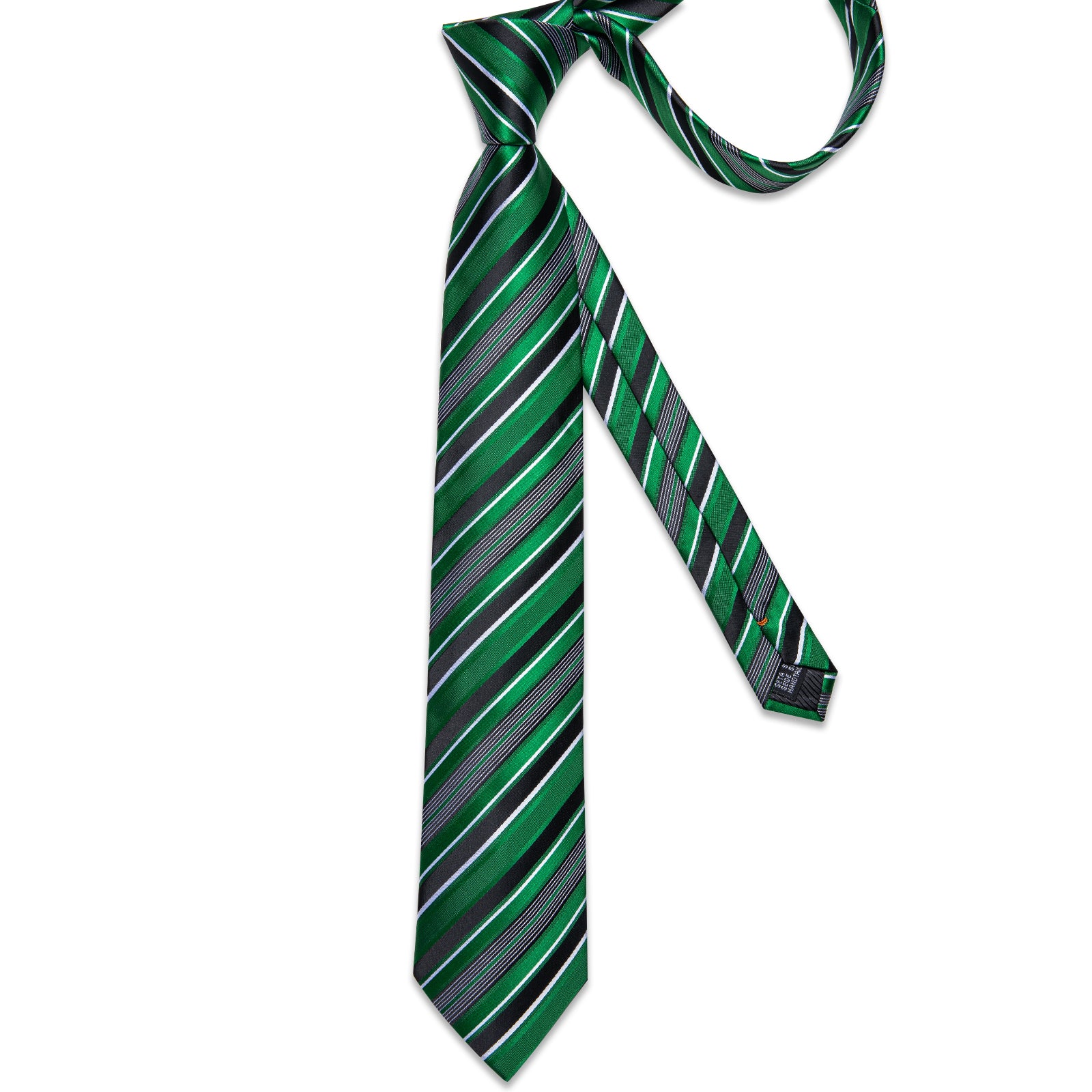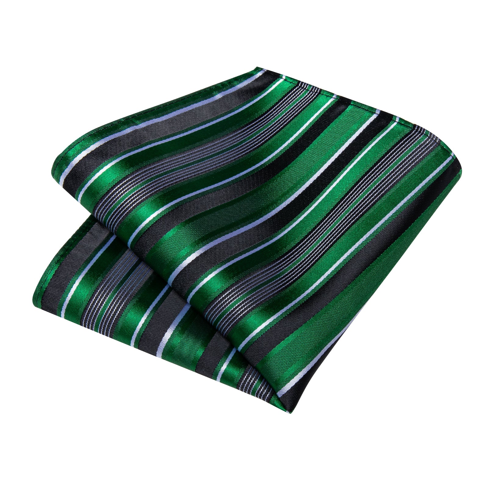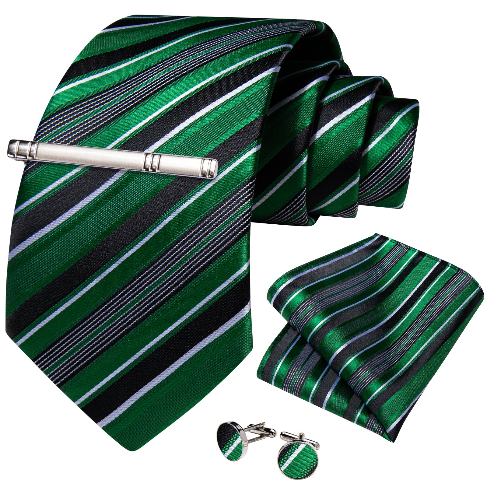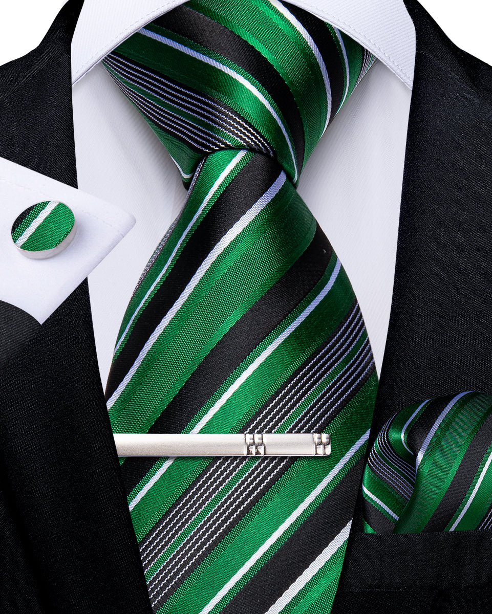 Green Black Stripe Men's Tie Handkerchief Cufflinks Clip Set