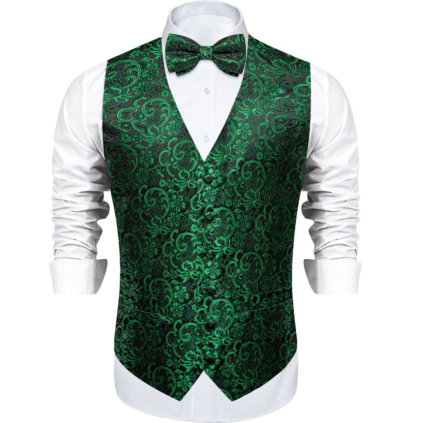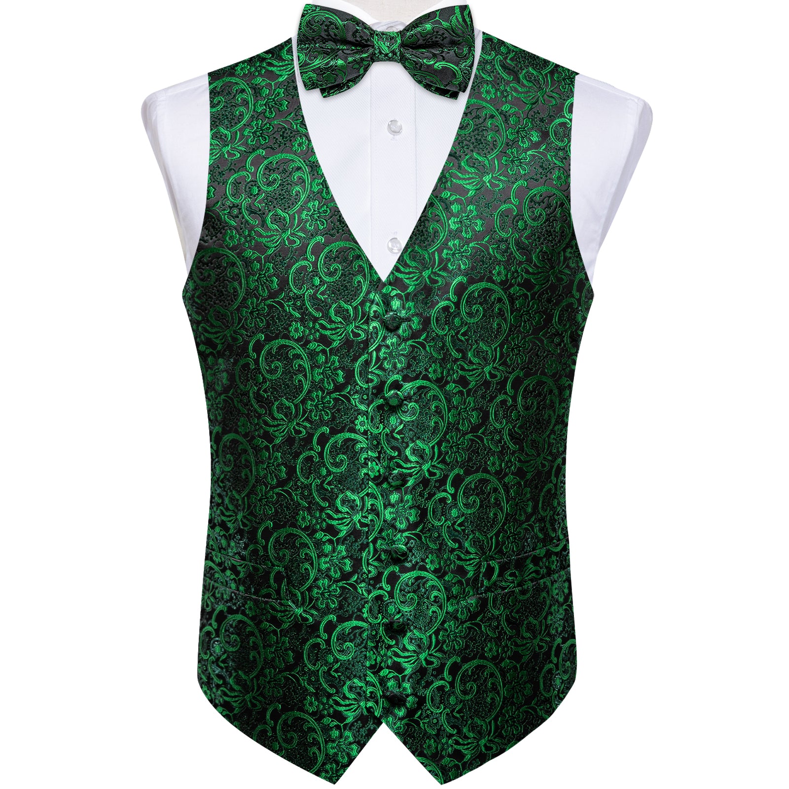 Green Floral Jacquard Silk Waistcoat Vest Bowtie Pocket Square Cufflinks Set