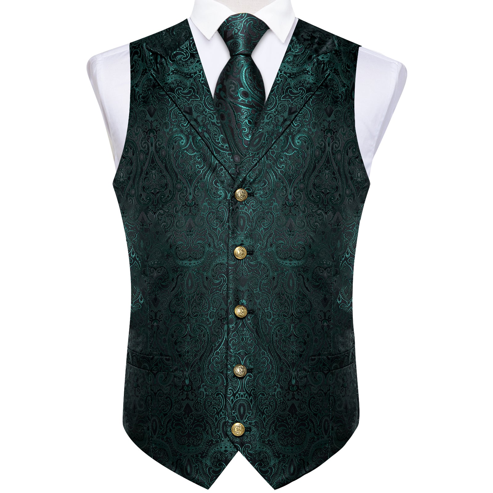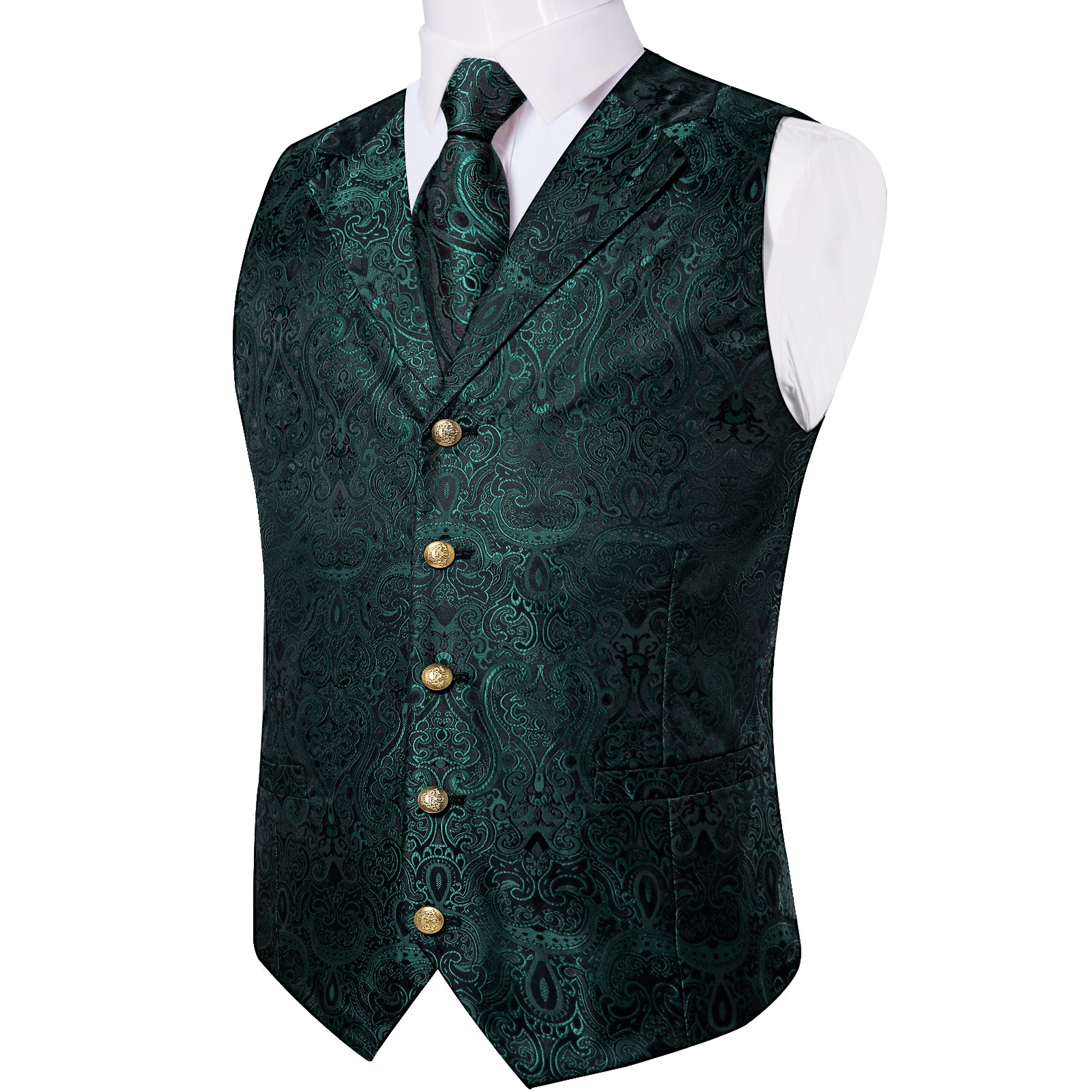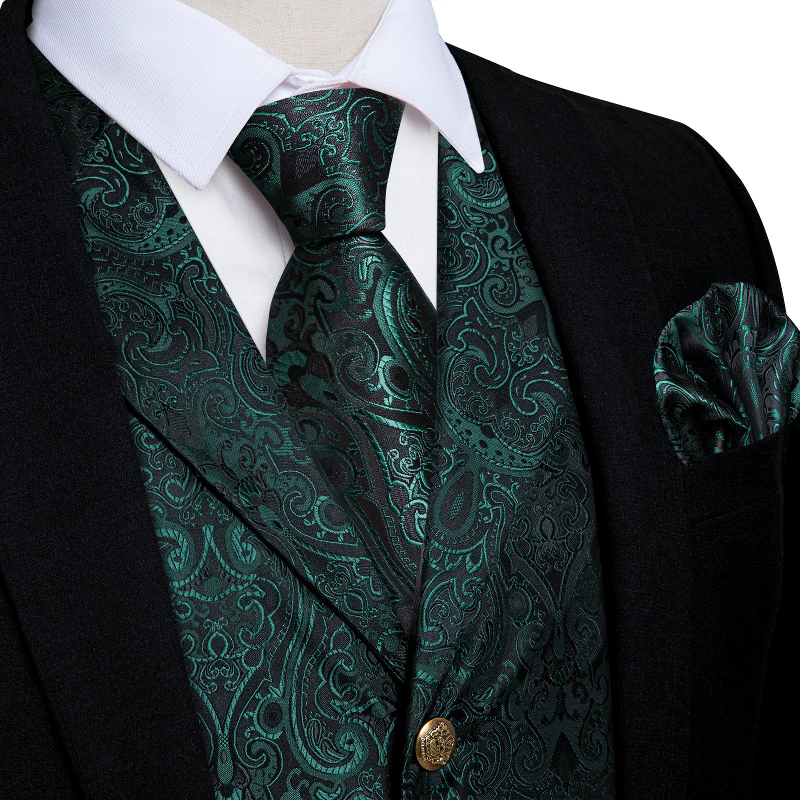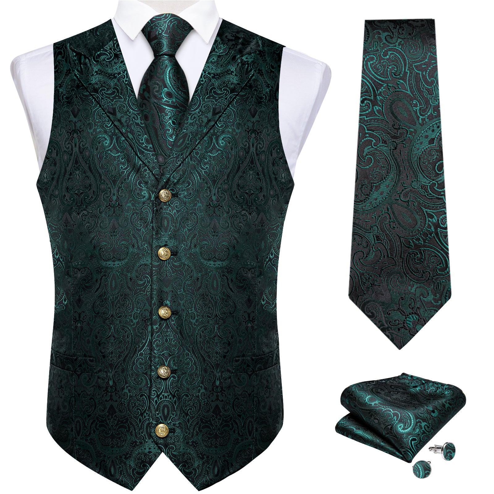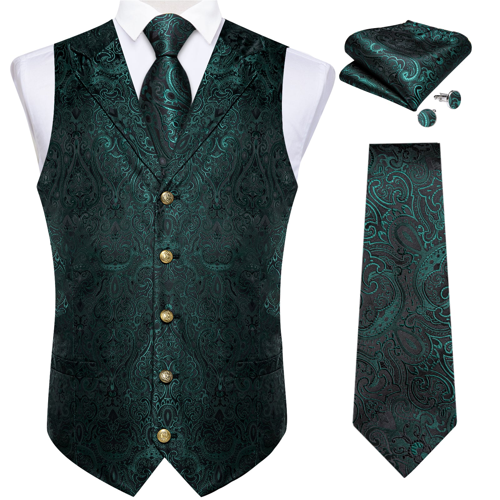Green Floral Jacquard V Neck Waistcoat Vest Tie Handkerchief Cufflinks Set
