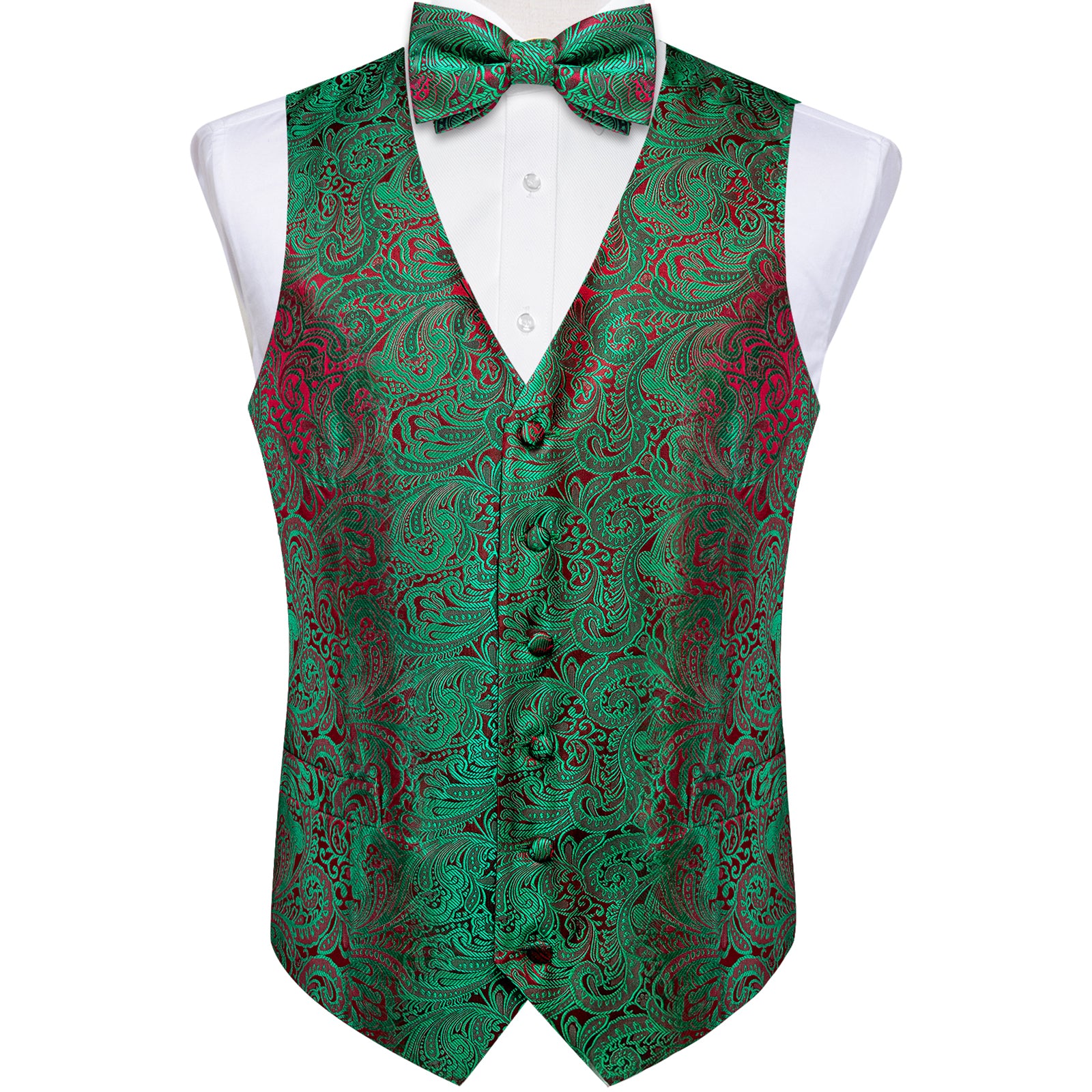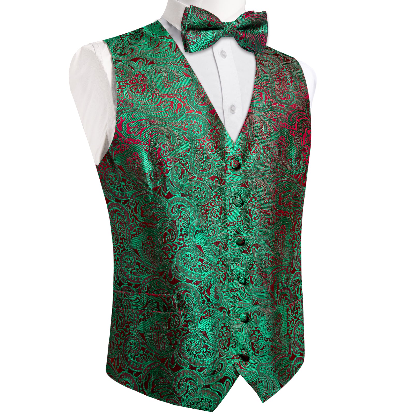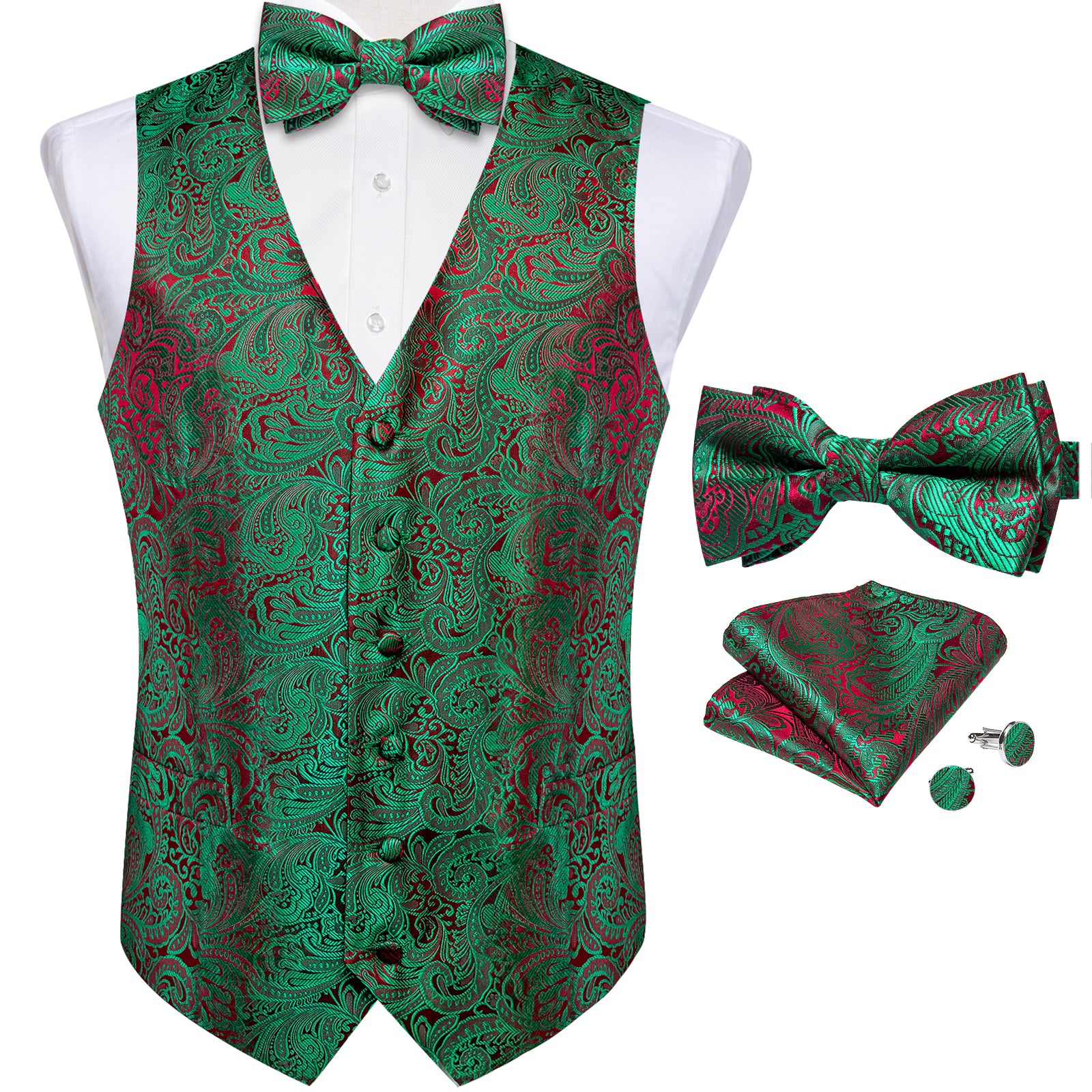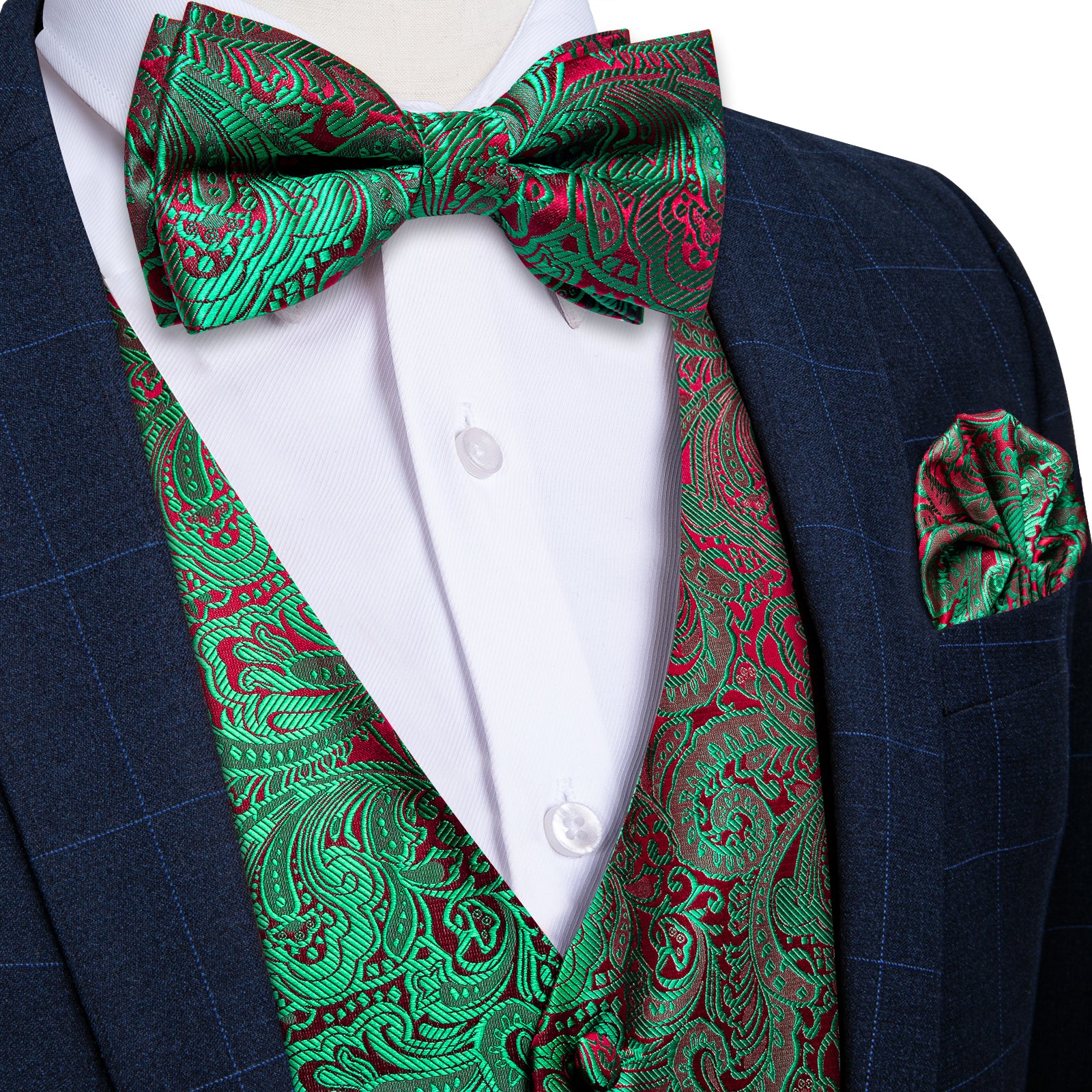 Green Floral Jacquard Waistcoat Vest BowTie Handkerchief Cufflinks Set