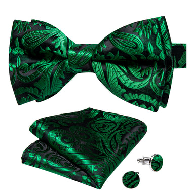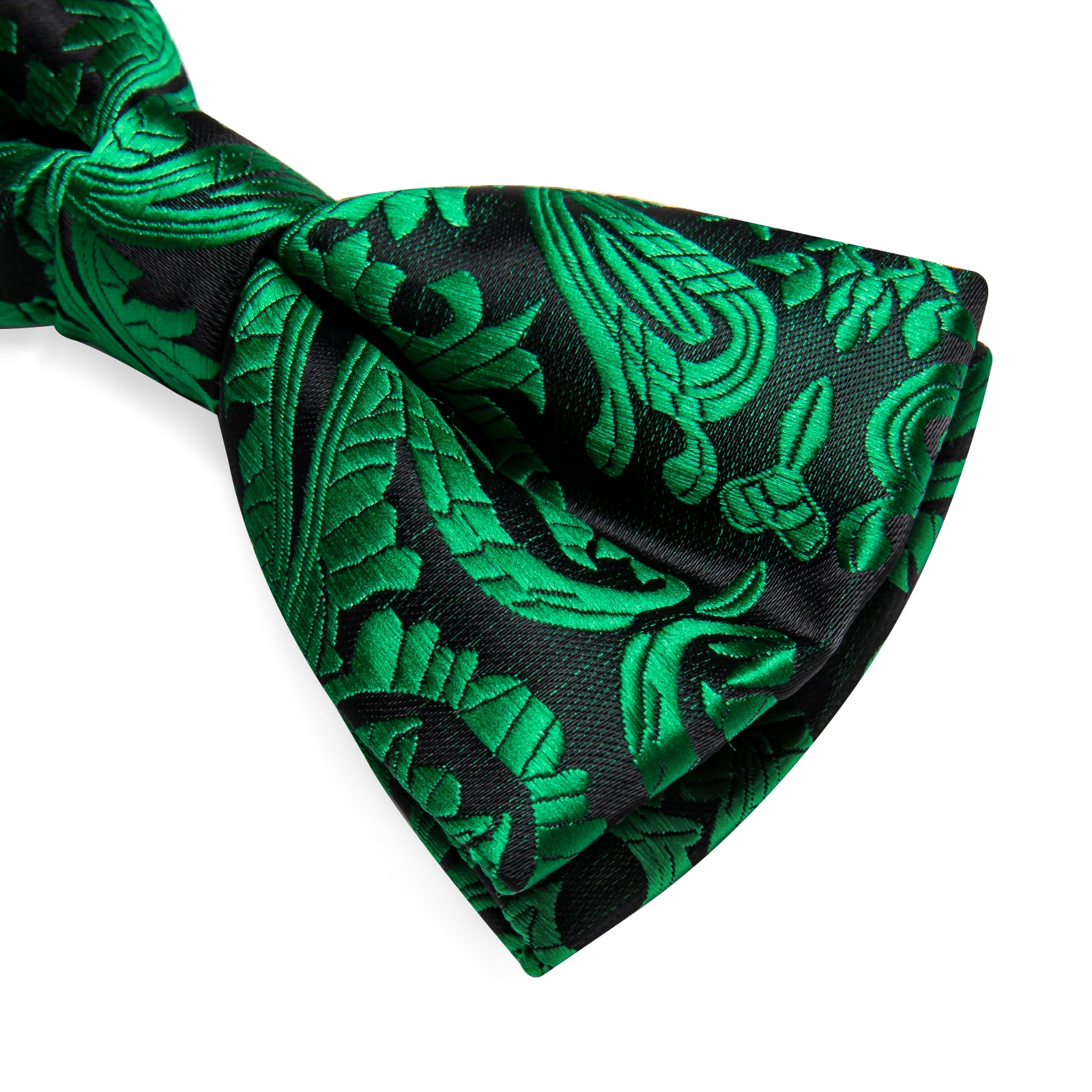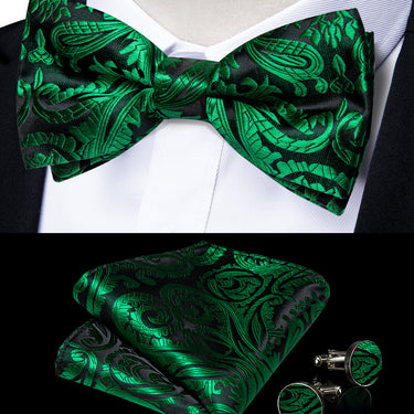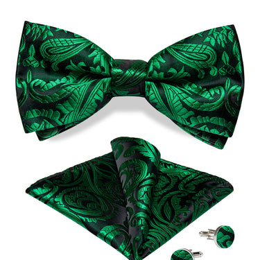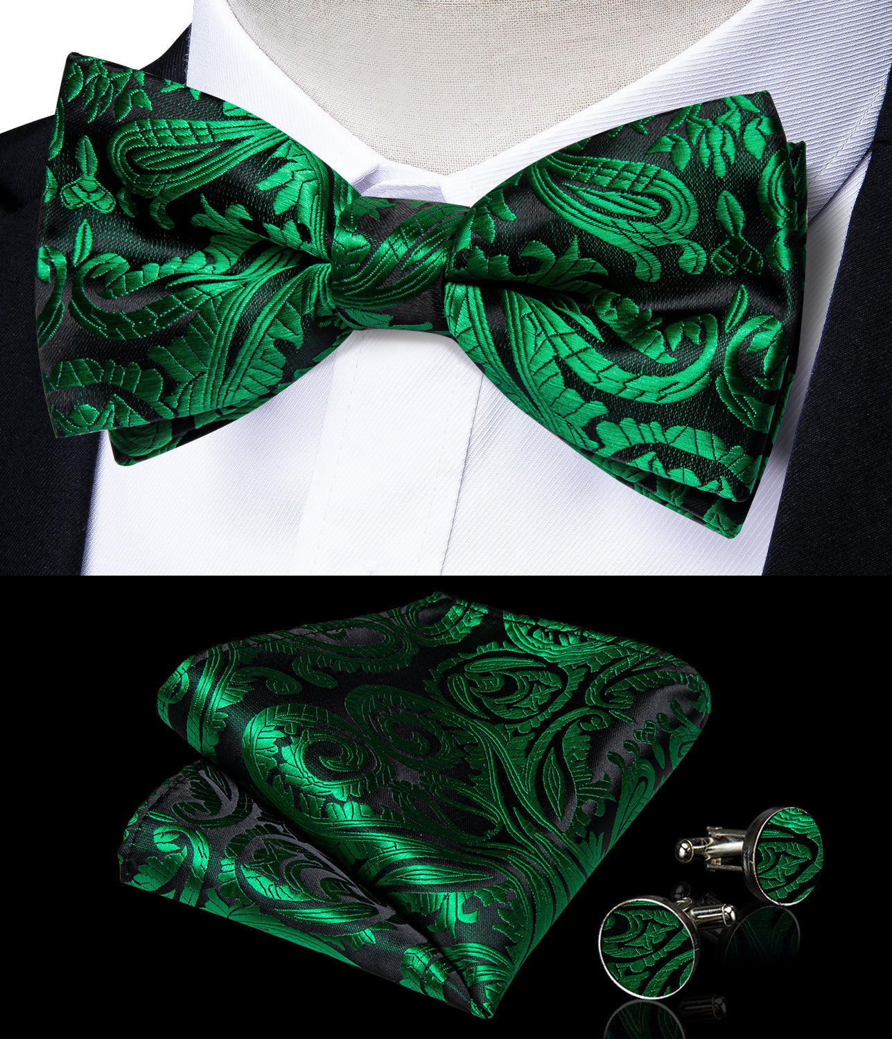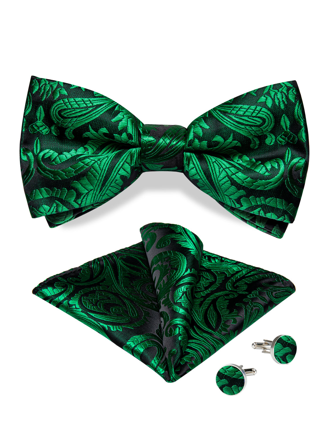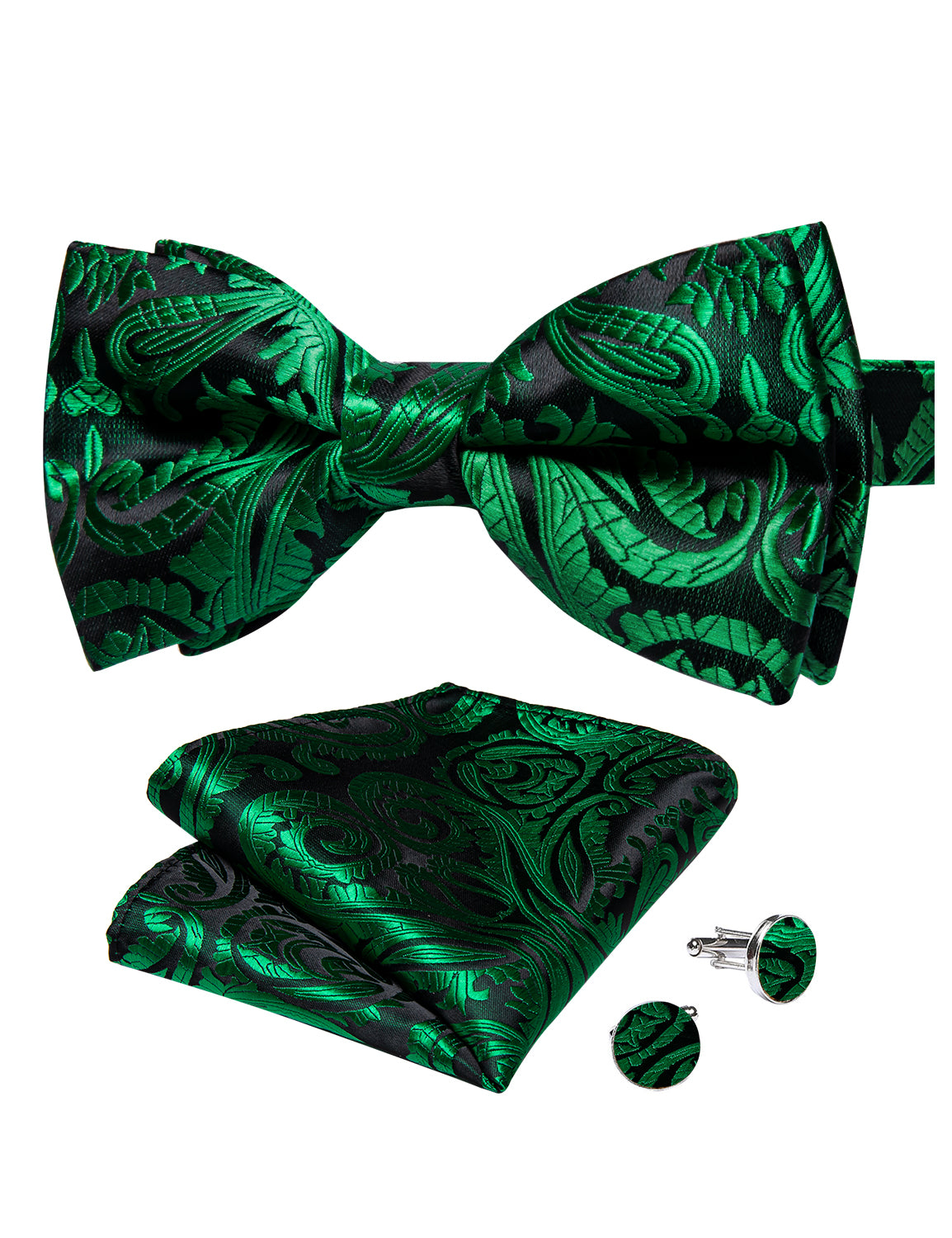Green Floral Silk Bowtie Pocket Square Cufflinks Set