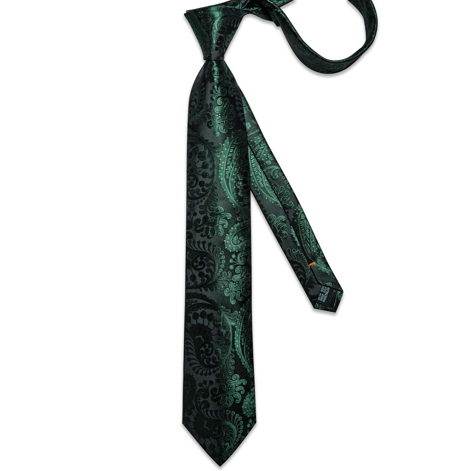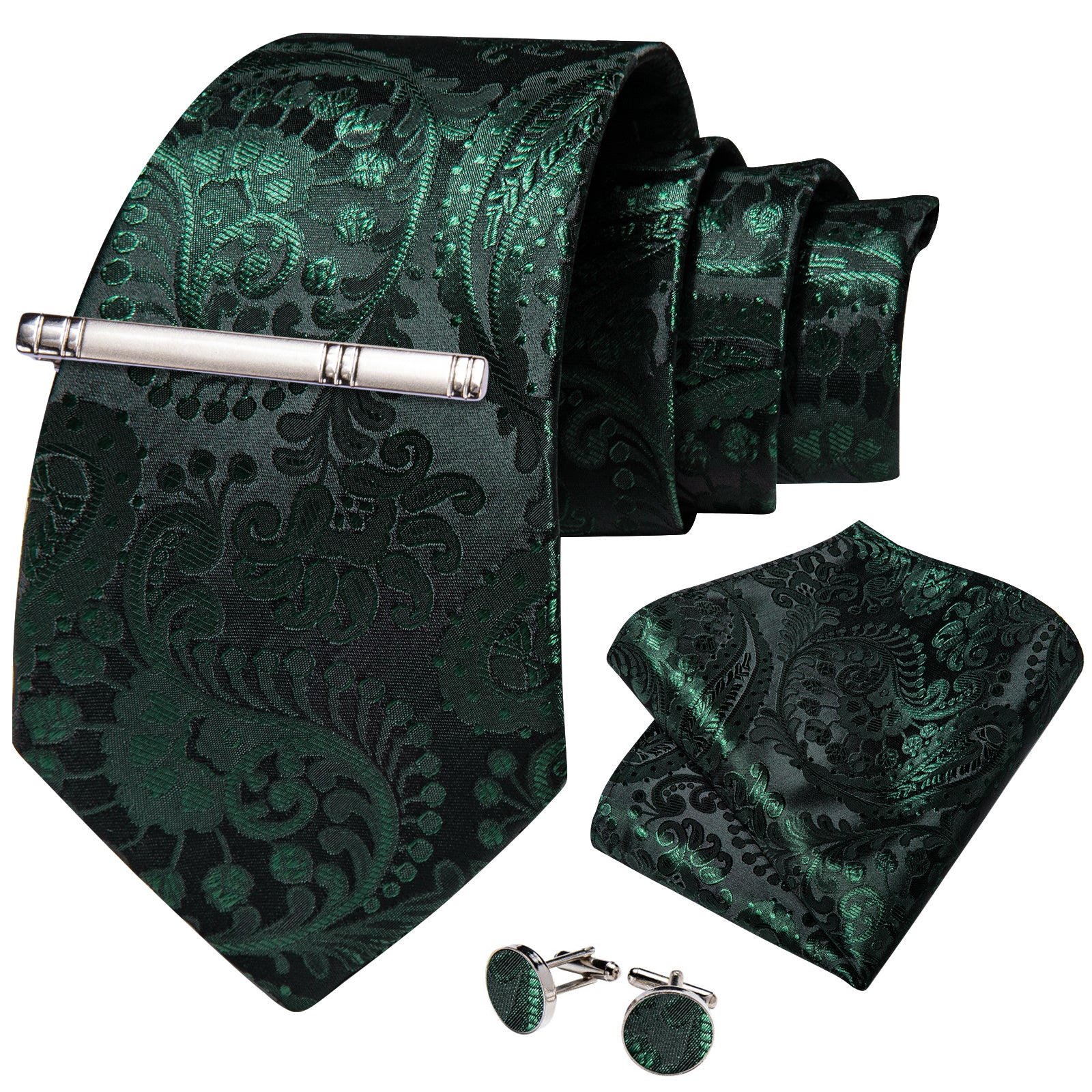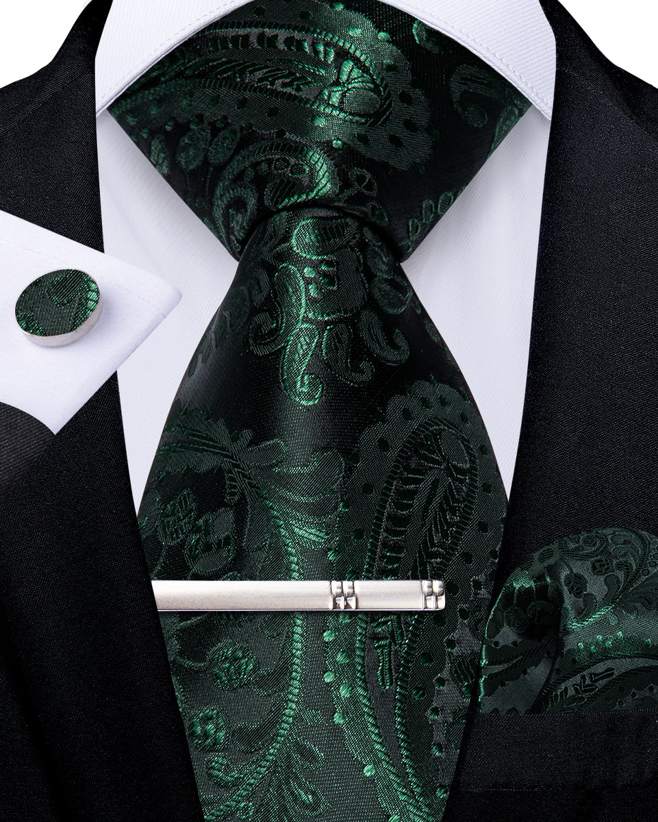 Green Paisley Men's Tie Handkerchief Cufflinks Clip Set