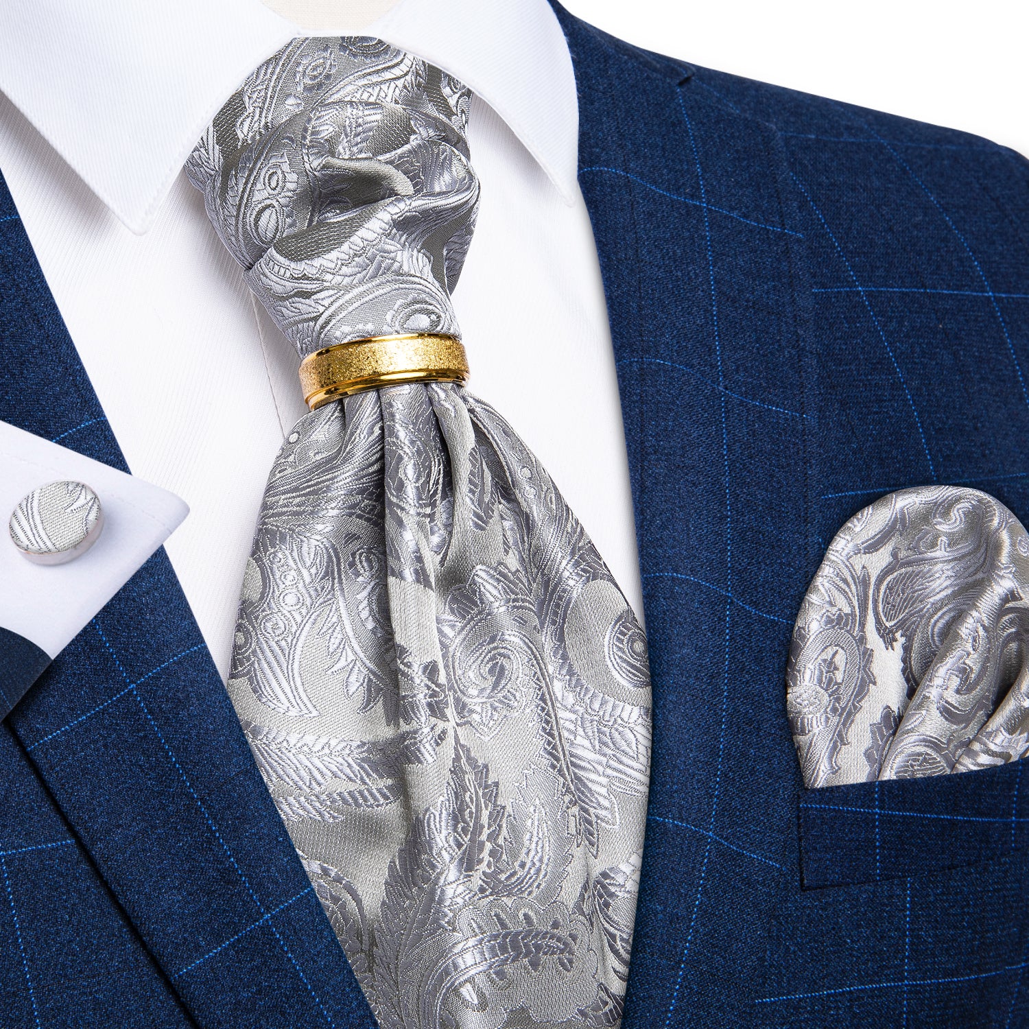 Grey Paisley Silk Cravat Woven Ascot Tie Pocket Square Cufflinks With Tie Ring Set