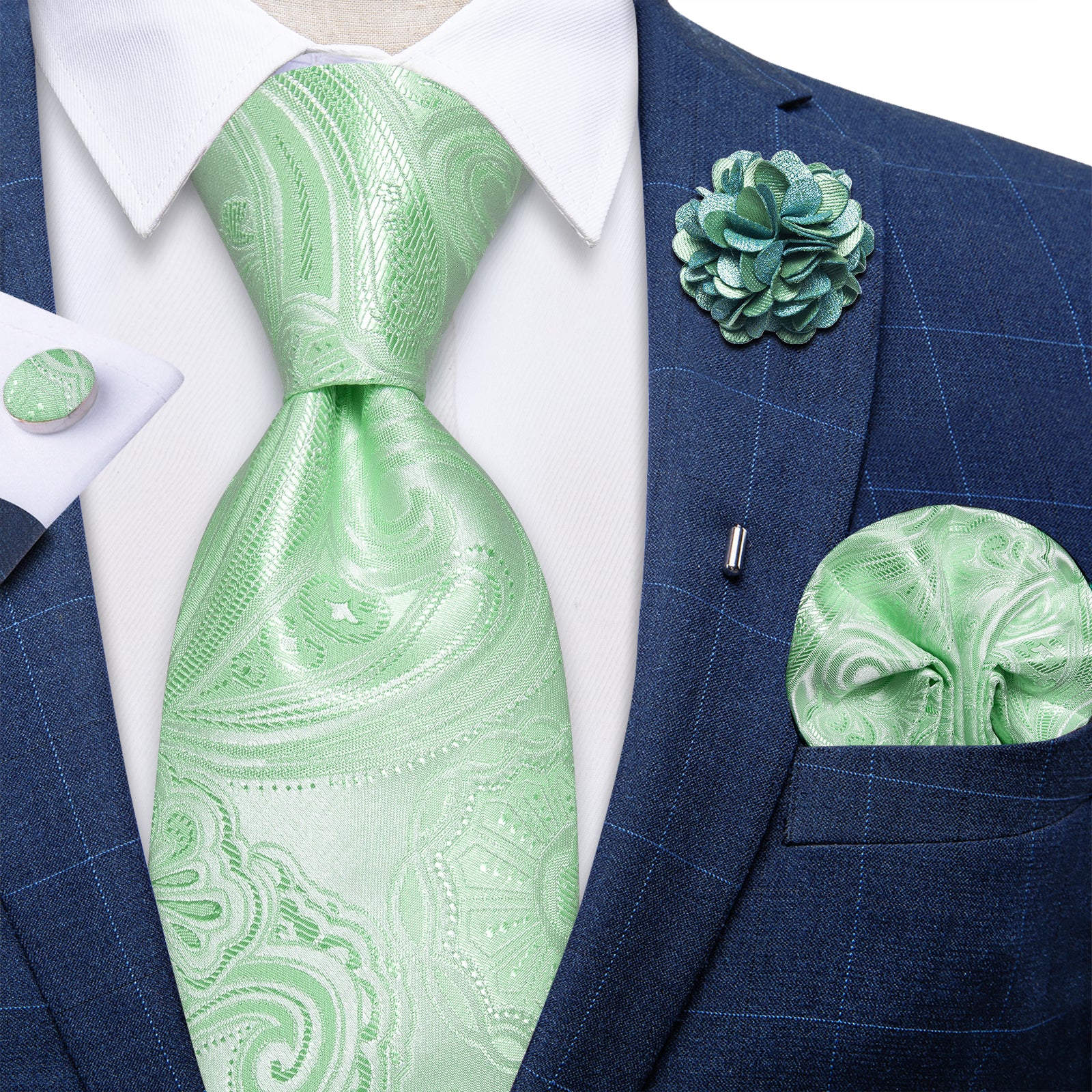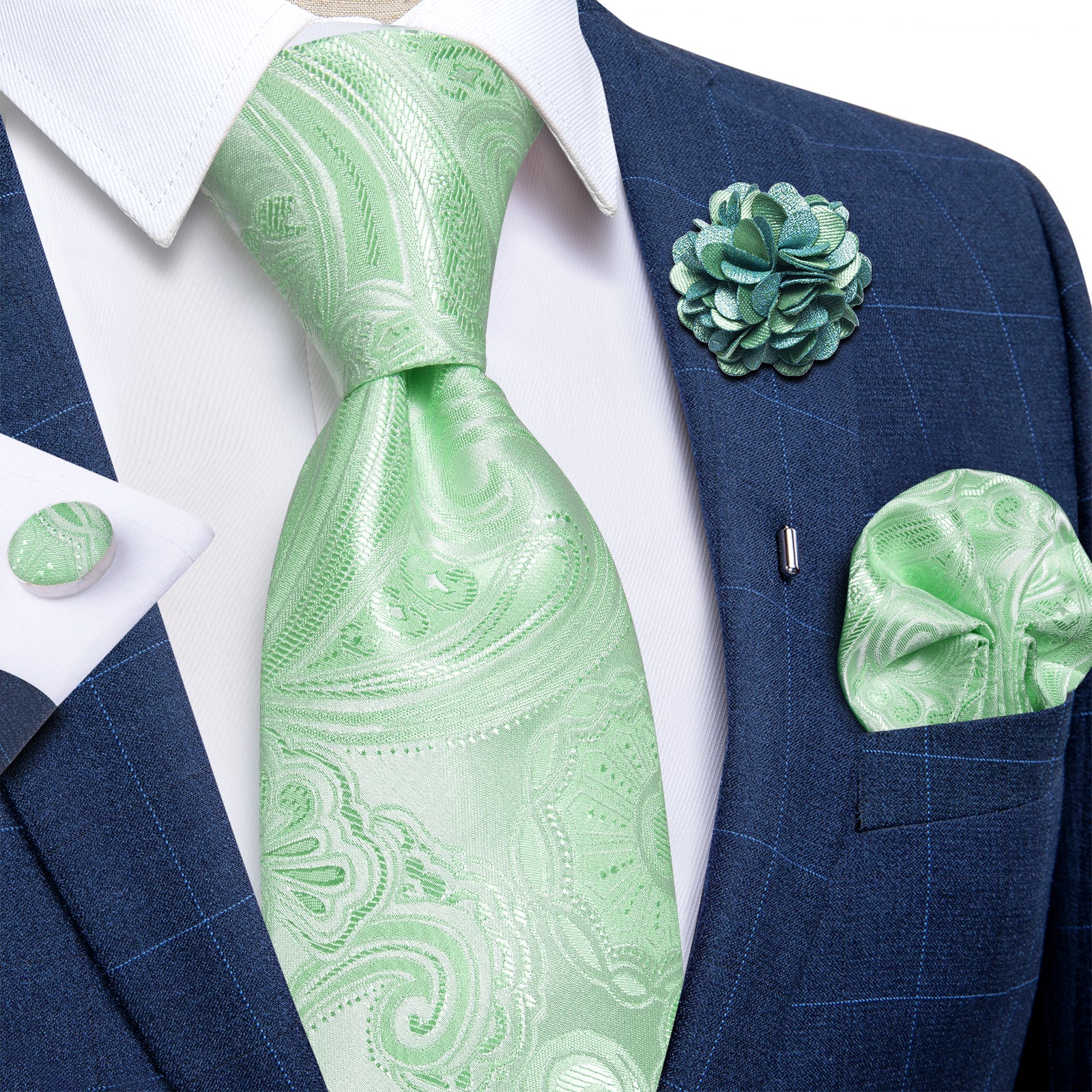 Light Green Floral Silk Men's Necktie Handkerchief Cufflinks Set With Lapel Pin Brooch Set