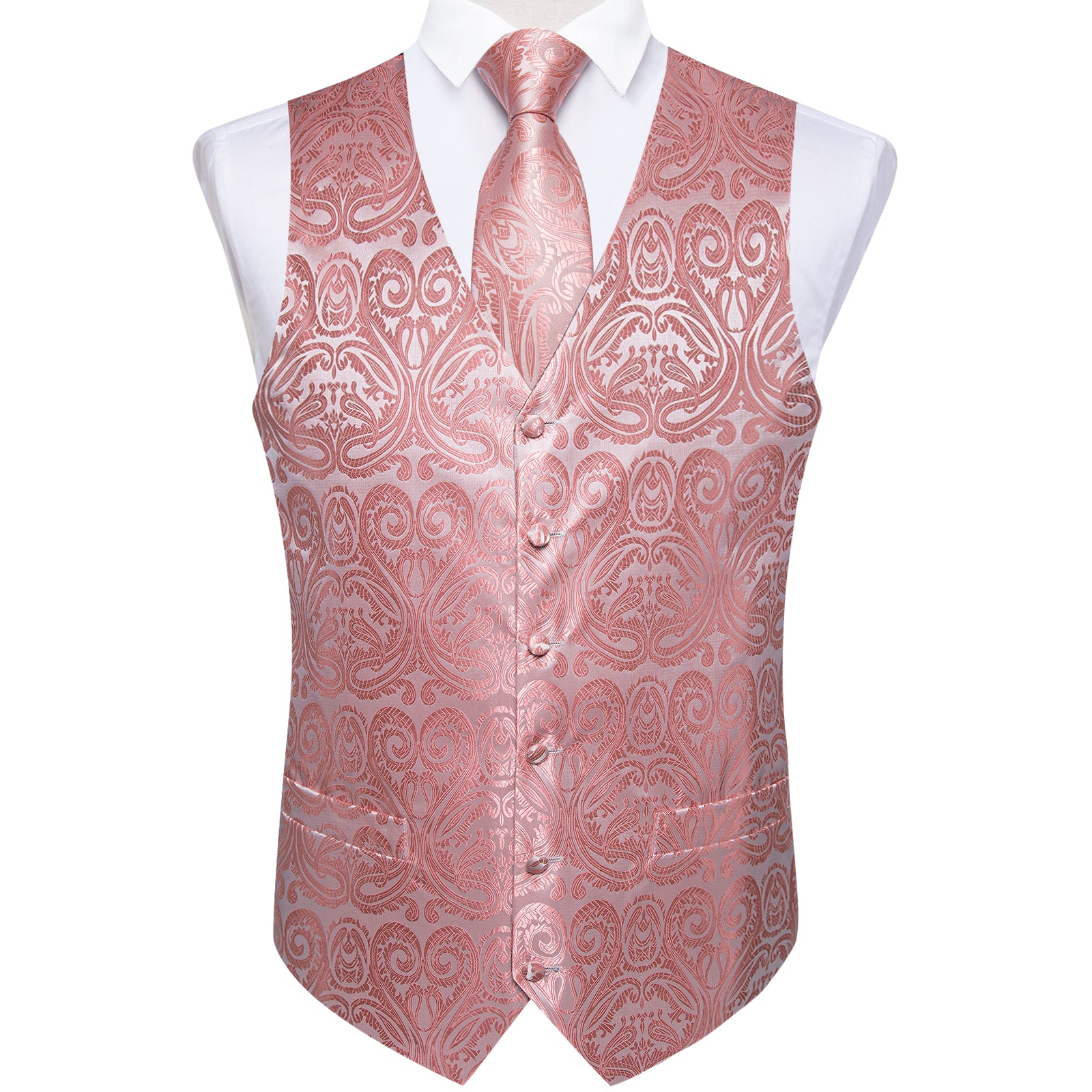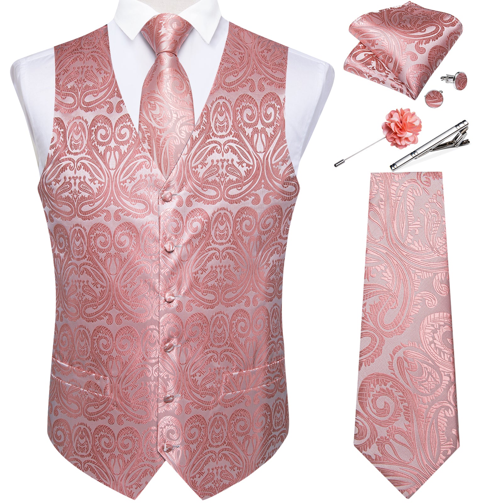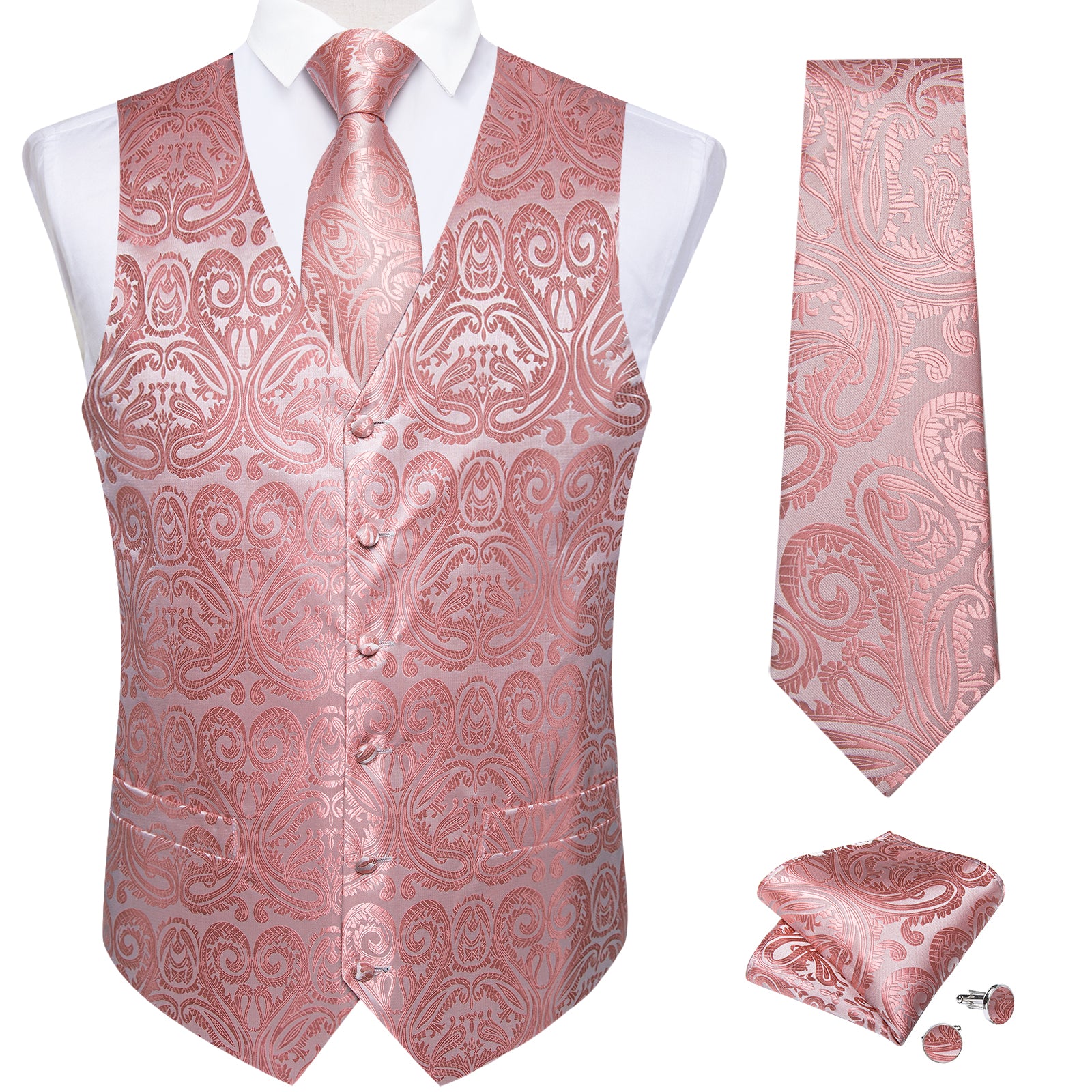 Men's Classic Pink Floral Jacquard Silk Waistcoat Vest Tie Handkerchief Cufflinks Suit Set