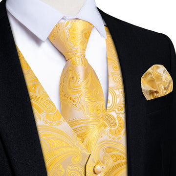 Men's Classic Yellow Floral Jacquard Silk Waistcoat Vest Tie Handkerchief Cufflinks Suit Set