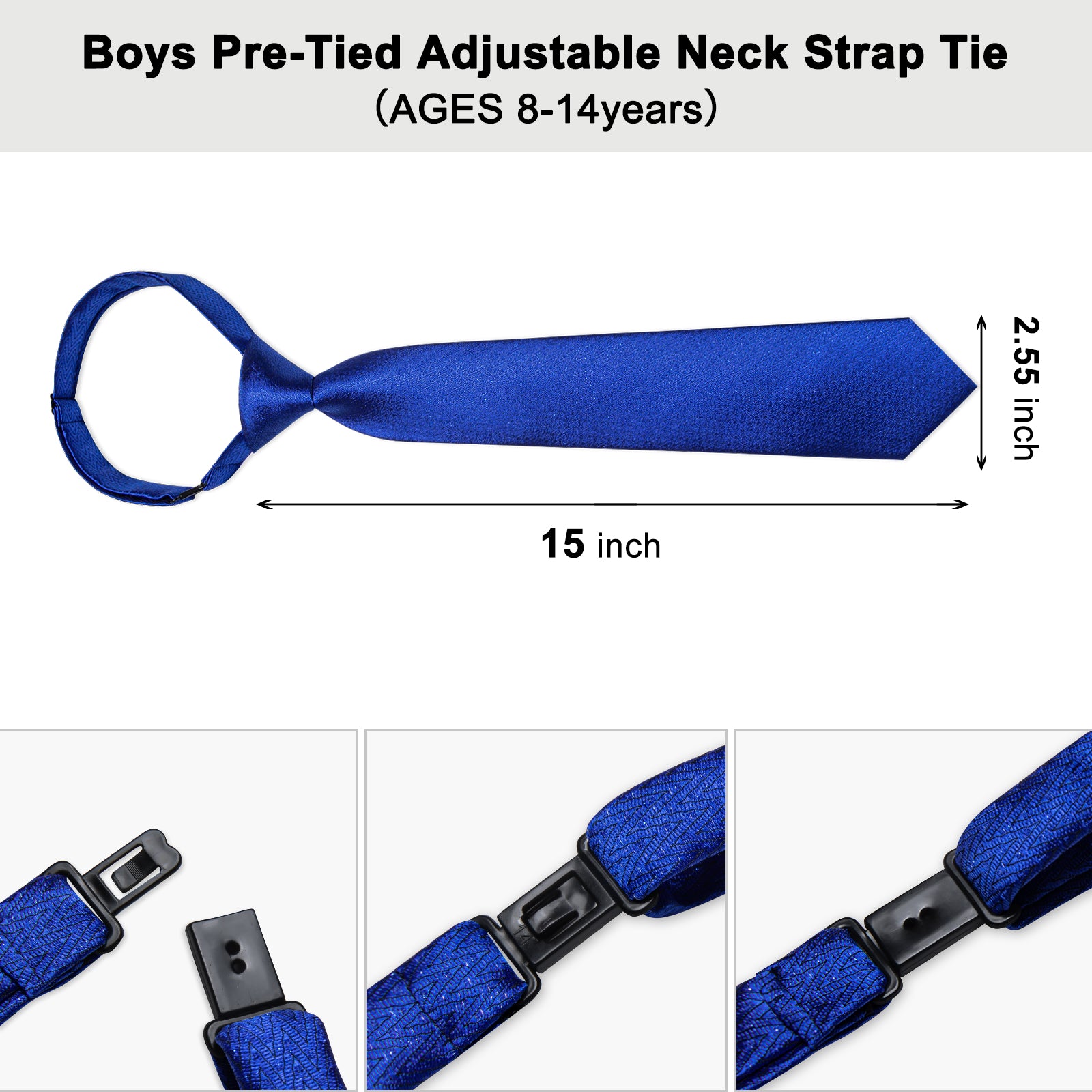 【Classic Size】Tie size:2.55 inches Wide and 15 inches from Knot to Bottom , Pocket Square size: 7.87 x 7.87 inches. Pre-tied boy's tie is suitable for 8-14 -year-old boys