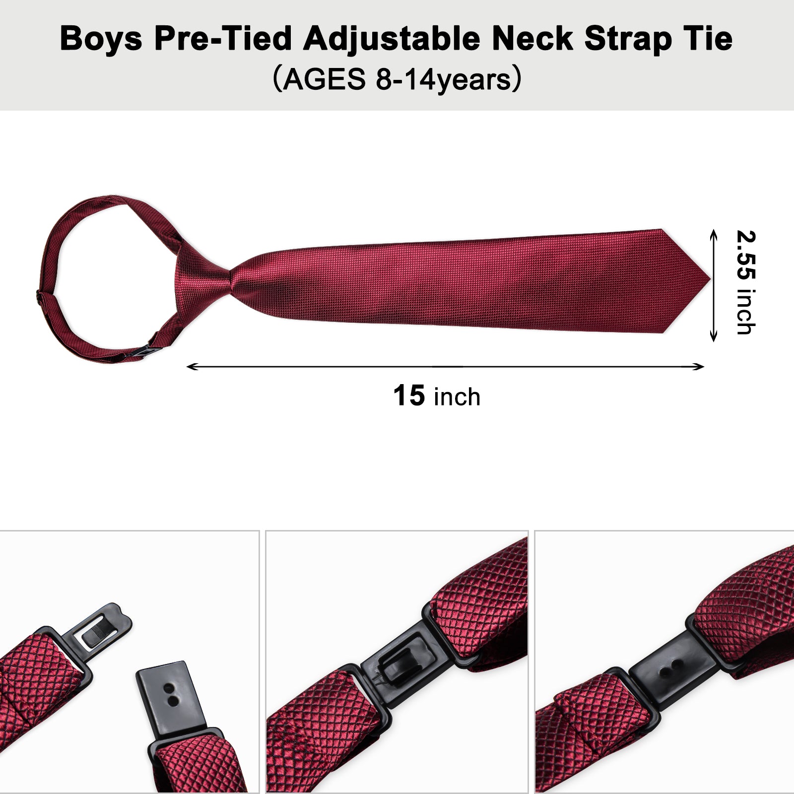 【Classic Size】Tie size:2.55 inches Wide and 15 inches from Knot to Bottom , Pocket Square size: 7.87 x 7.87 inches. Pre-tied boy's tie is suitable for 8-14 -year-old boys