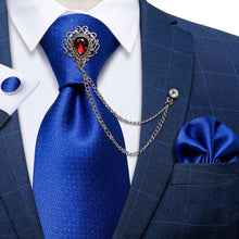 Novelty Blue Silk Men's Necktie Handkerchief Cufflinks Set With GEM Lapel Pin Brooch Set