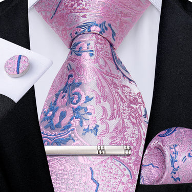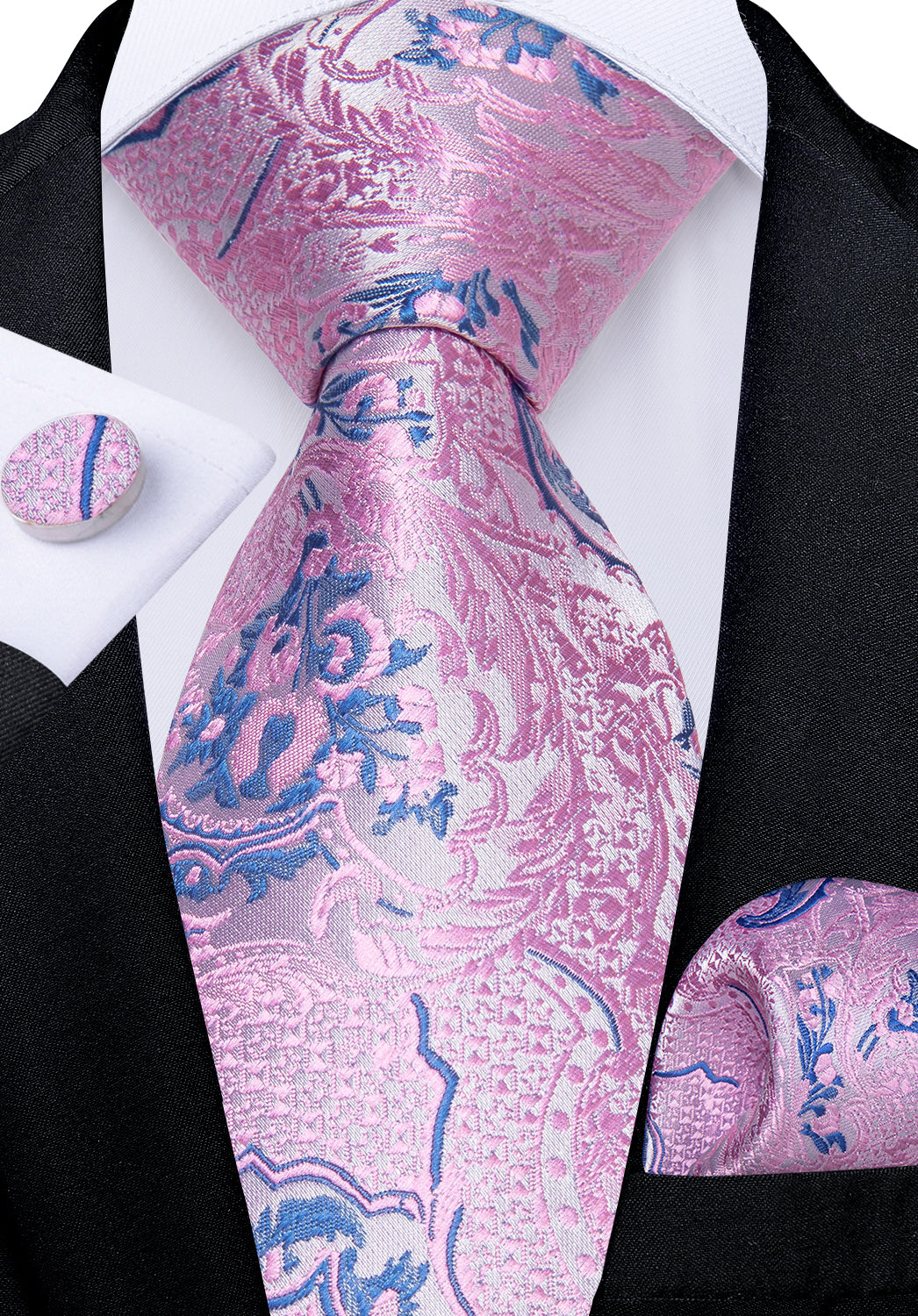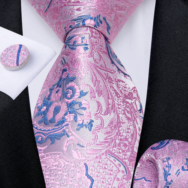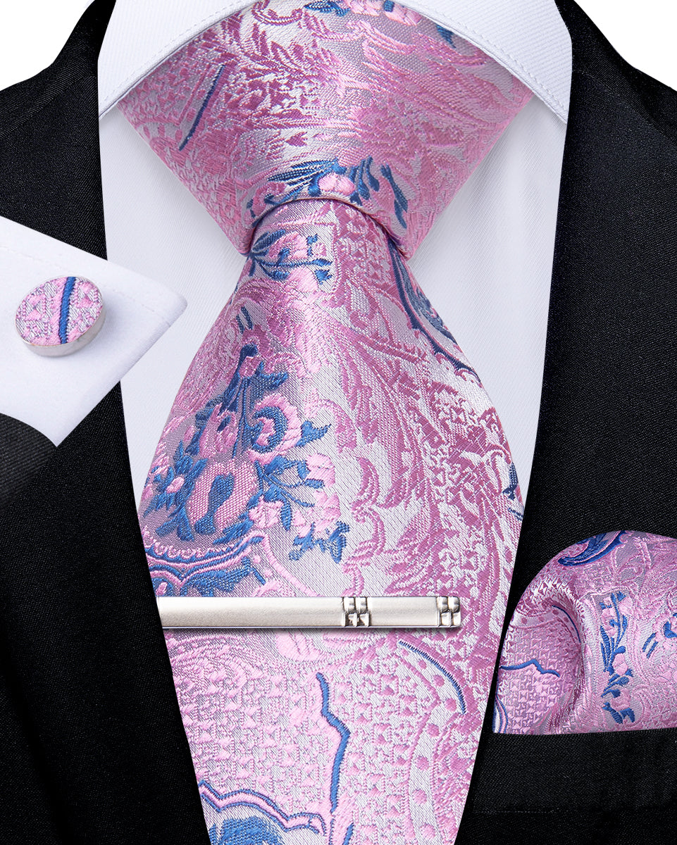 Pink Blue Floral Men's Tie Handkerchief Cufflinks Clip Set