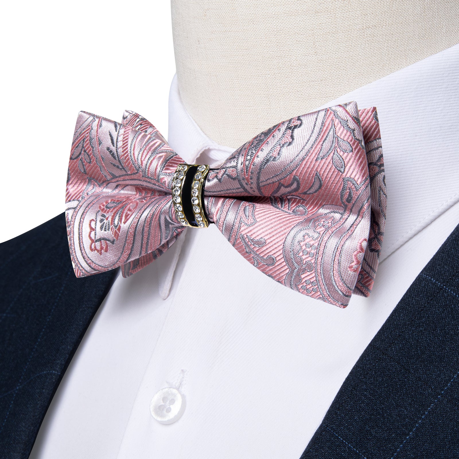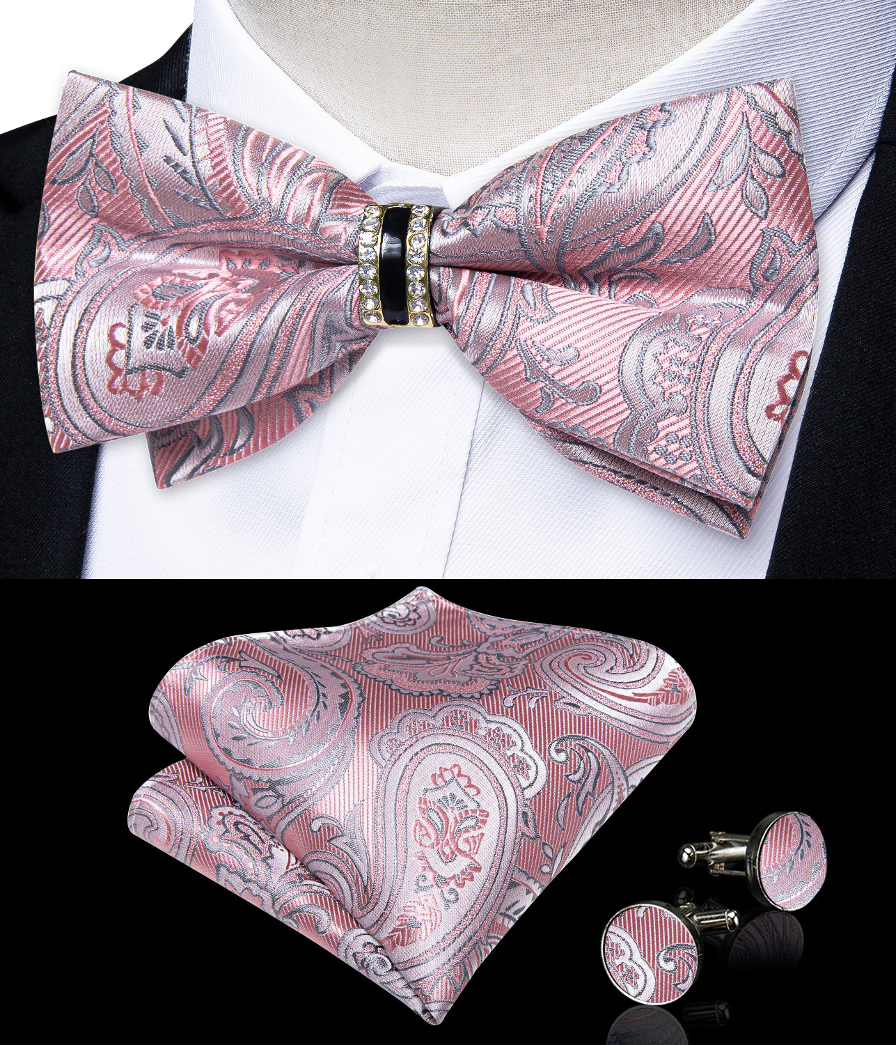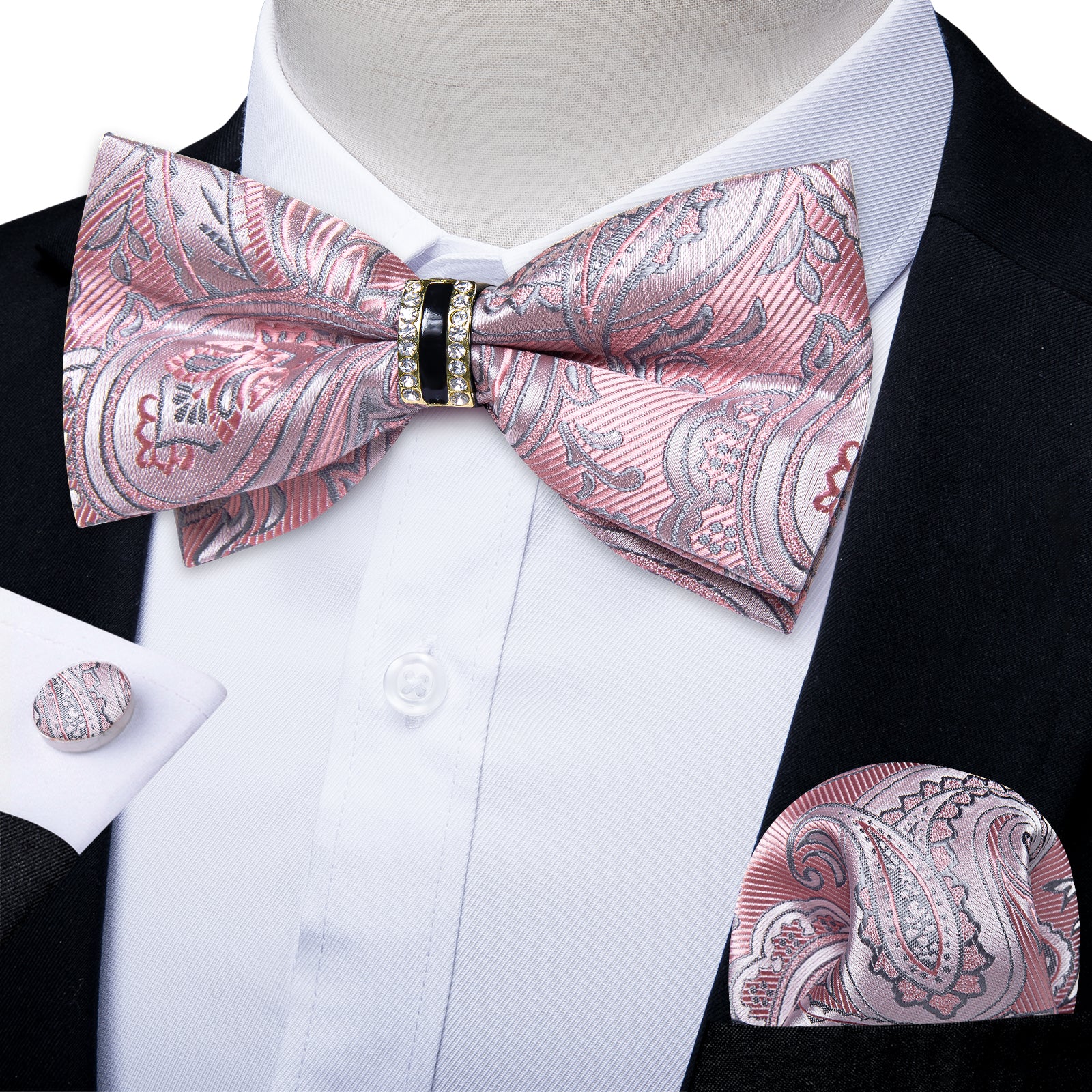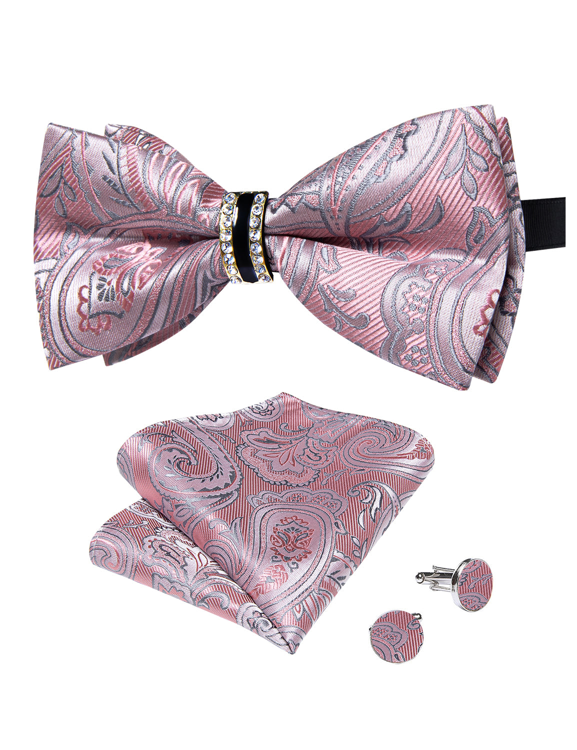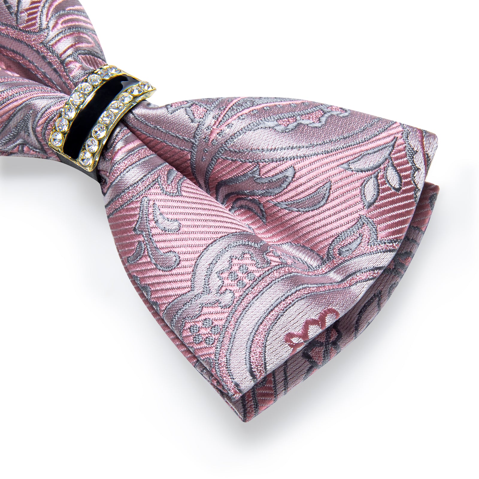 Pink Floral Diamond Plastic Ring Men's Pre-Bowtie Pocket Square Cufflinks Set