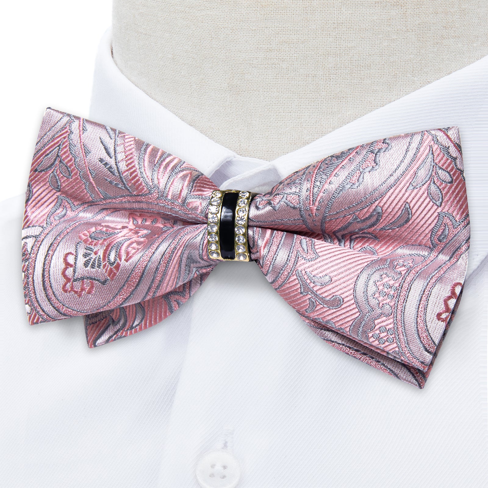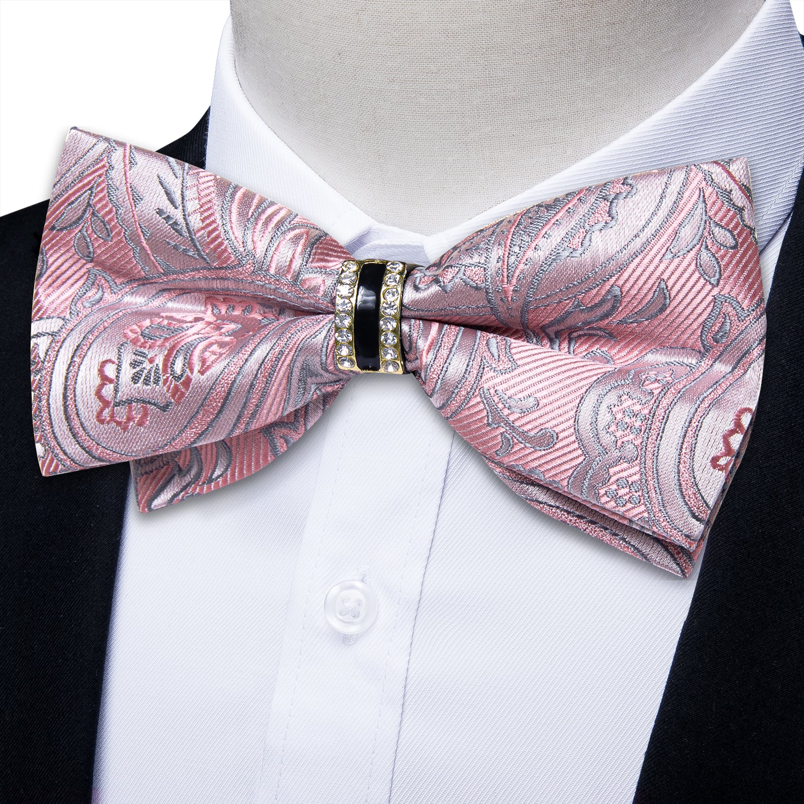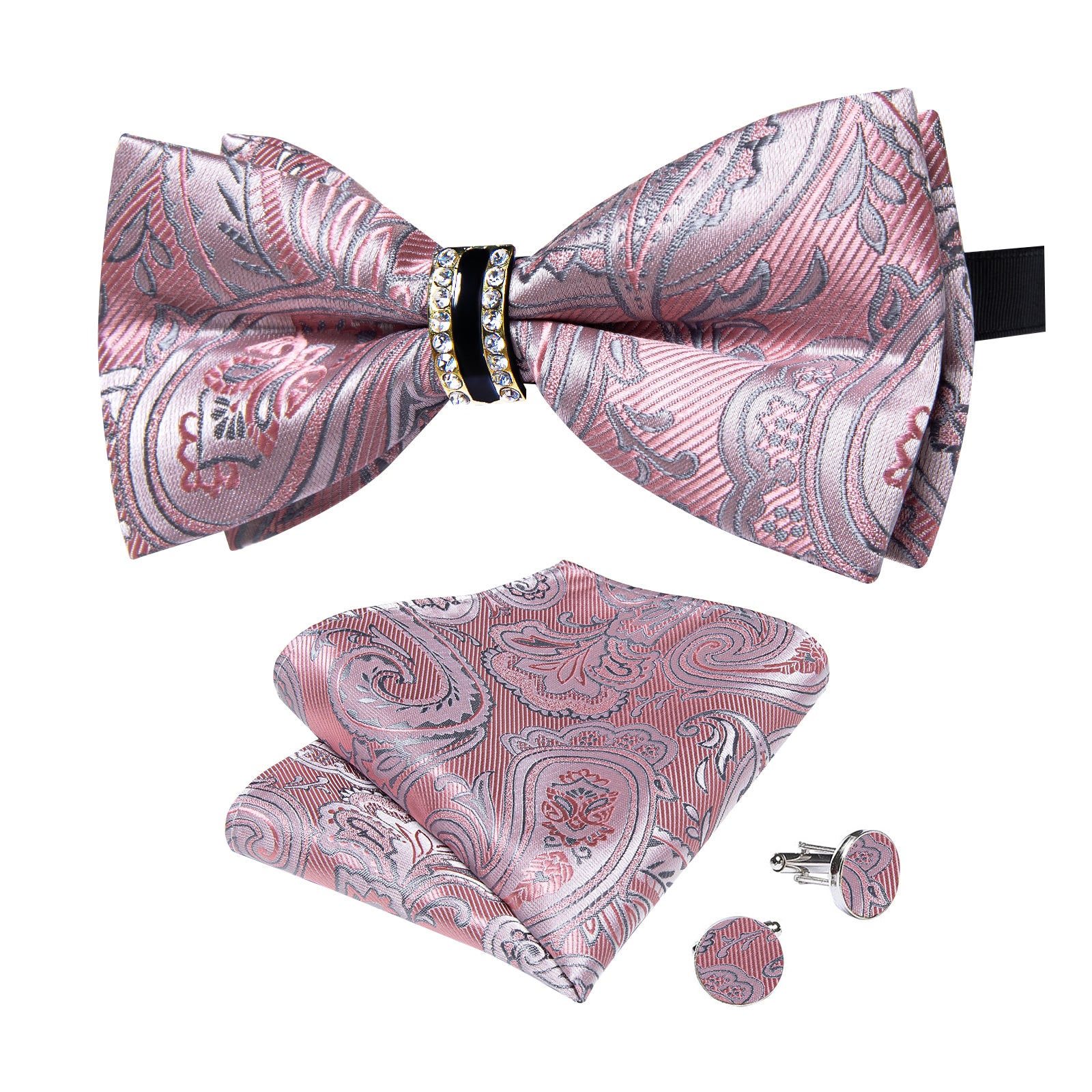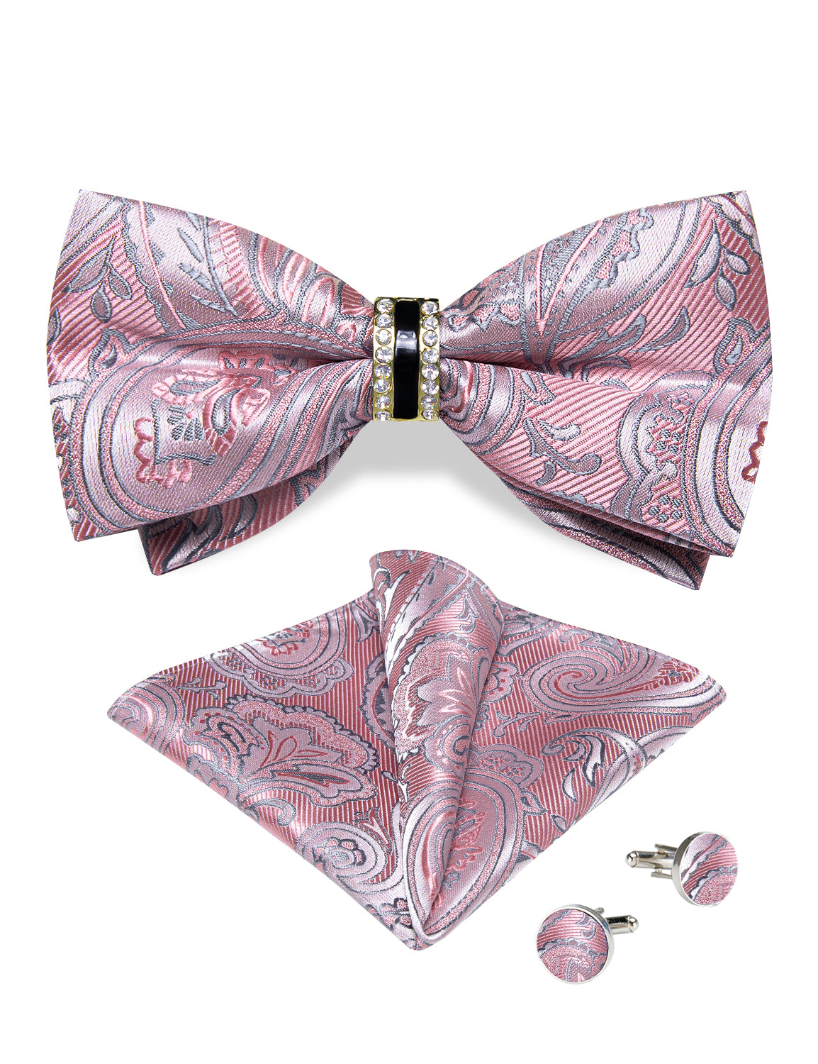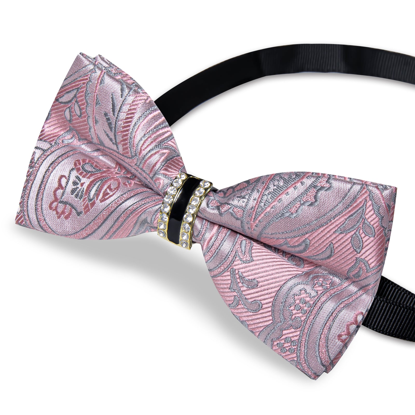 Pink Floral Diamond Plastic Ring Men's Pre-Bowtie Pocket Square Cufflinks Set