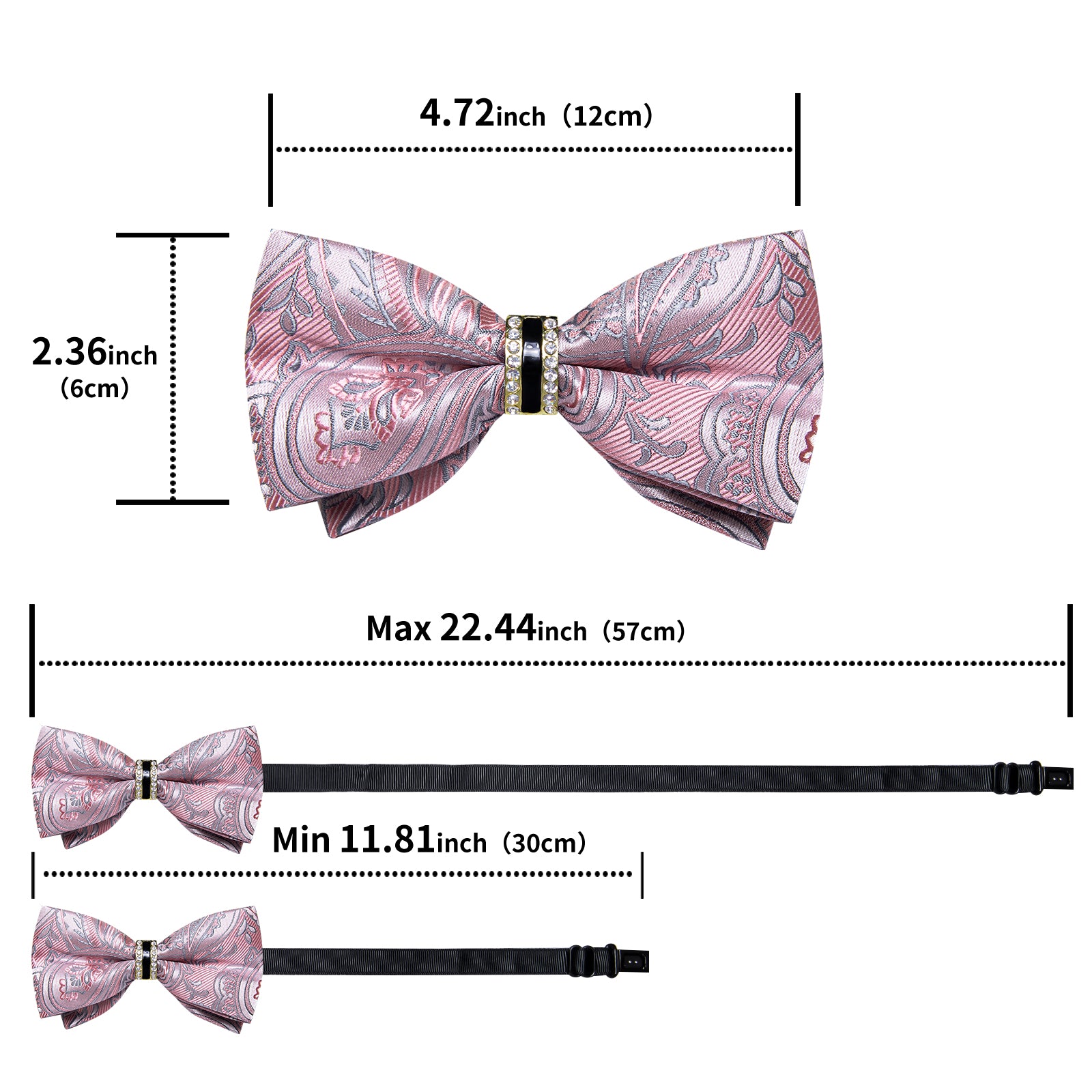 【Classic Size】Bow tie size: 4.72 inches x 2.36 inches,Adjustable Neck Size: 11.81 inches - 22.44 inches,Pocket Square size: 9 inches x 9 inches,Cufflink Diameter:0.55 inches.Exquisite men's bowtie set is suitable for a variety of dress shirts and suit tuxedo