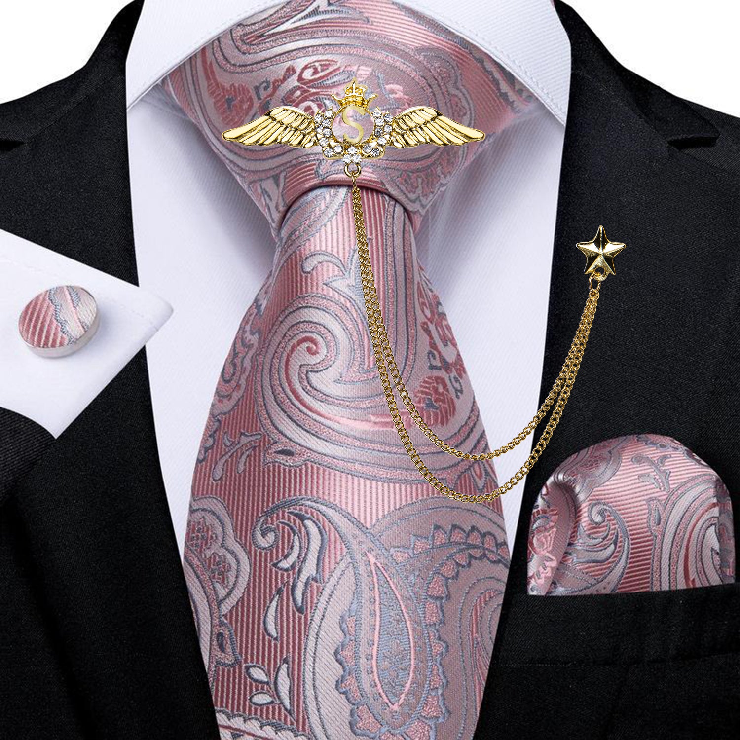 Pink Grey Paisley Tie Handkerchief Cufflinks Set With Wing Lapel Pin Set