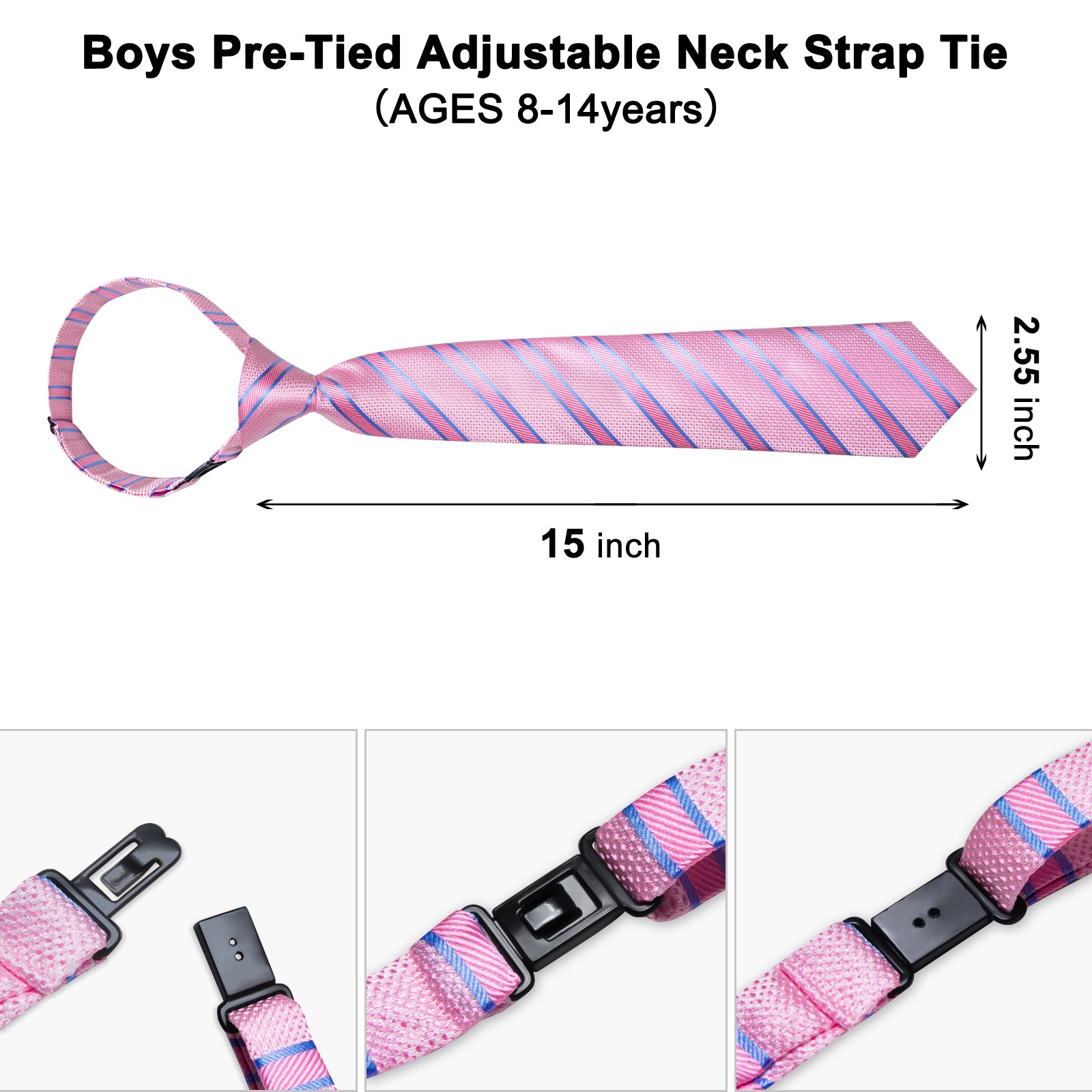 【Classic Size】Tie size:2.55 inches Wide and 15 inches from Knot to Bottom , Pocket Square size: 7.87 x 7.87 inches. Pre-tied boy's tie is suitable for 8-14 -year-old boys