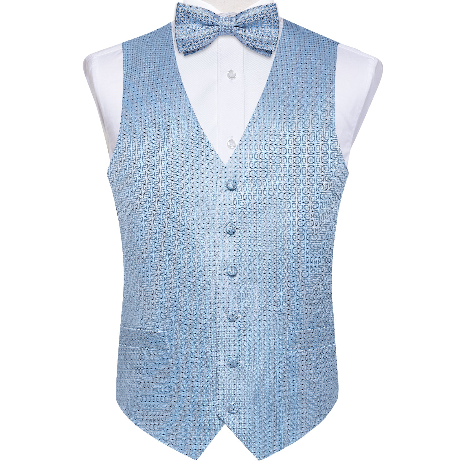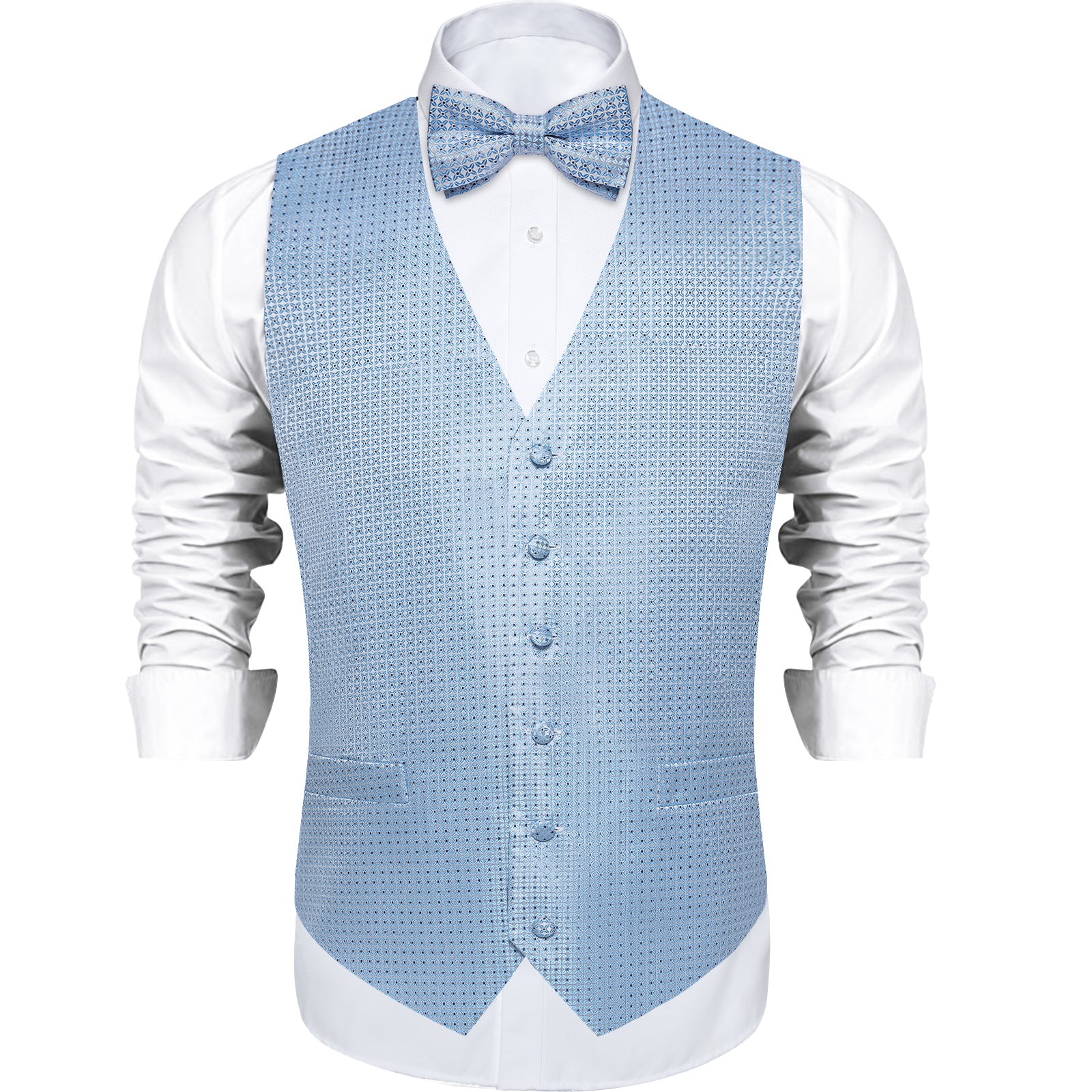 Sky Blue Plaid Jacquard Silk Waistcoat Vest Bowtie Pocket Square Cufflinks Set