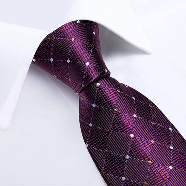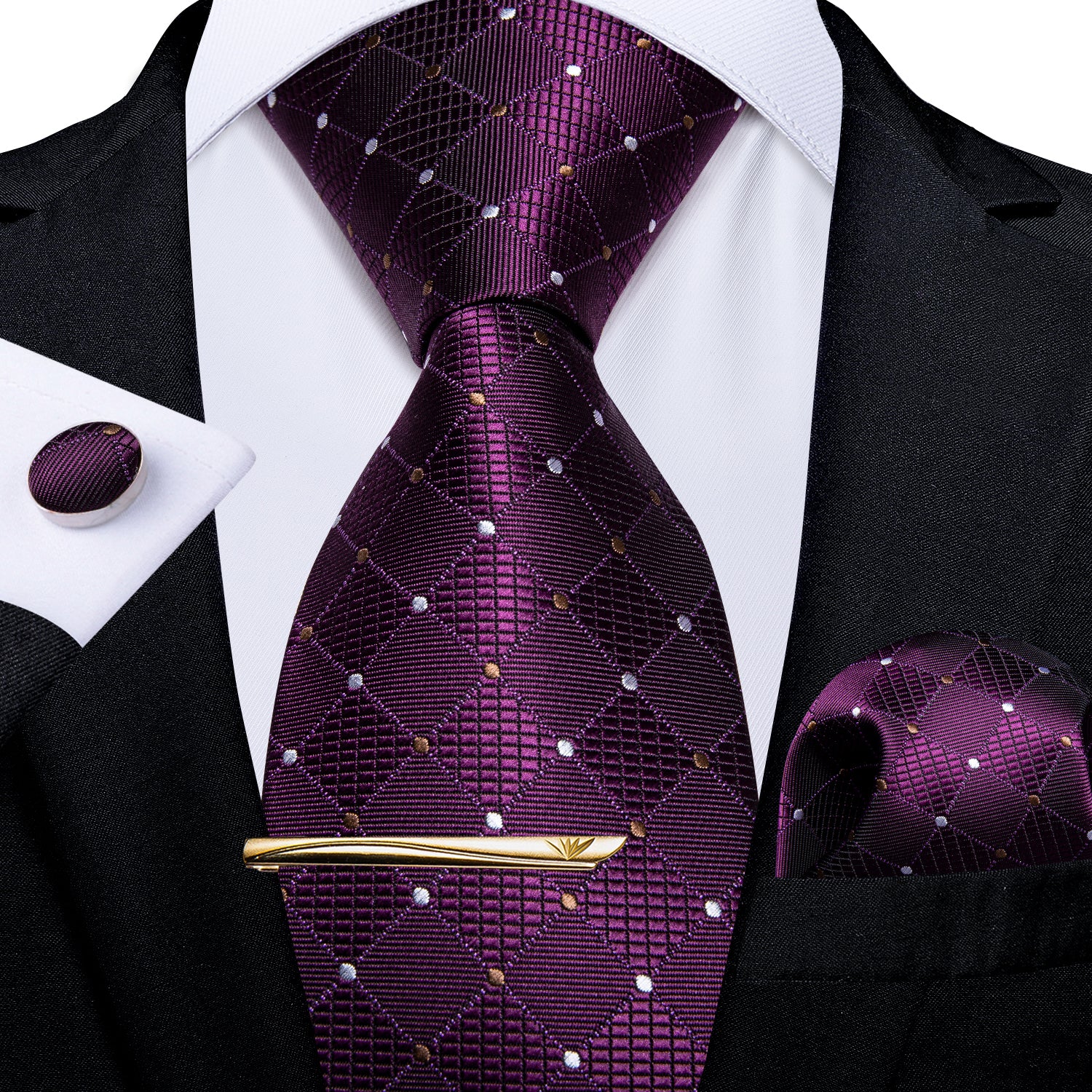 Purple White Plaid Men's Tie Handkerchief Cufflinks Clip Set